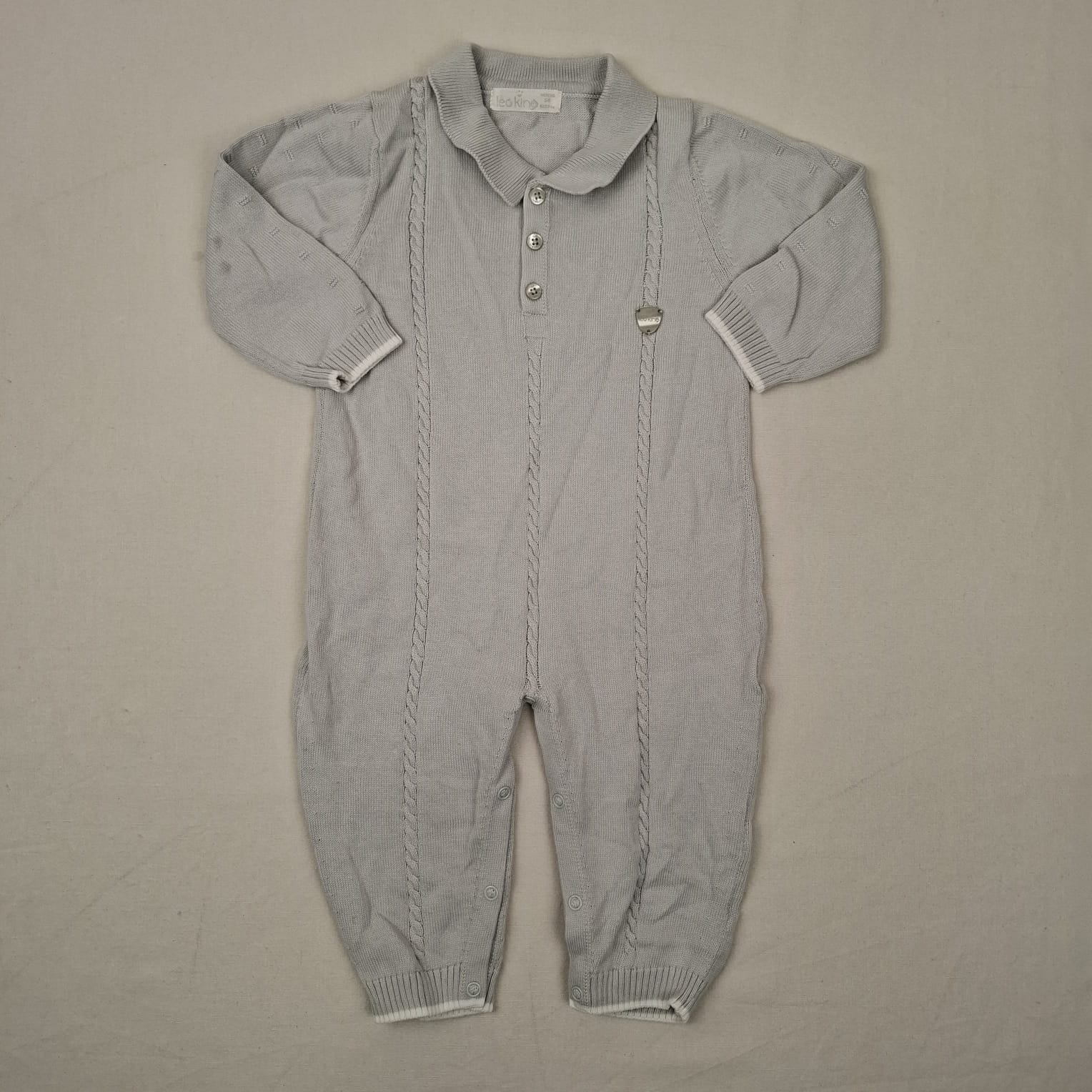 Autres commentaires : Combinaison longue bleu gris clair en maille, col polo, fermeture par boutons devant et fermeture par boutons pression à l’entrejambe.