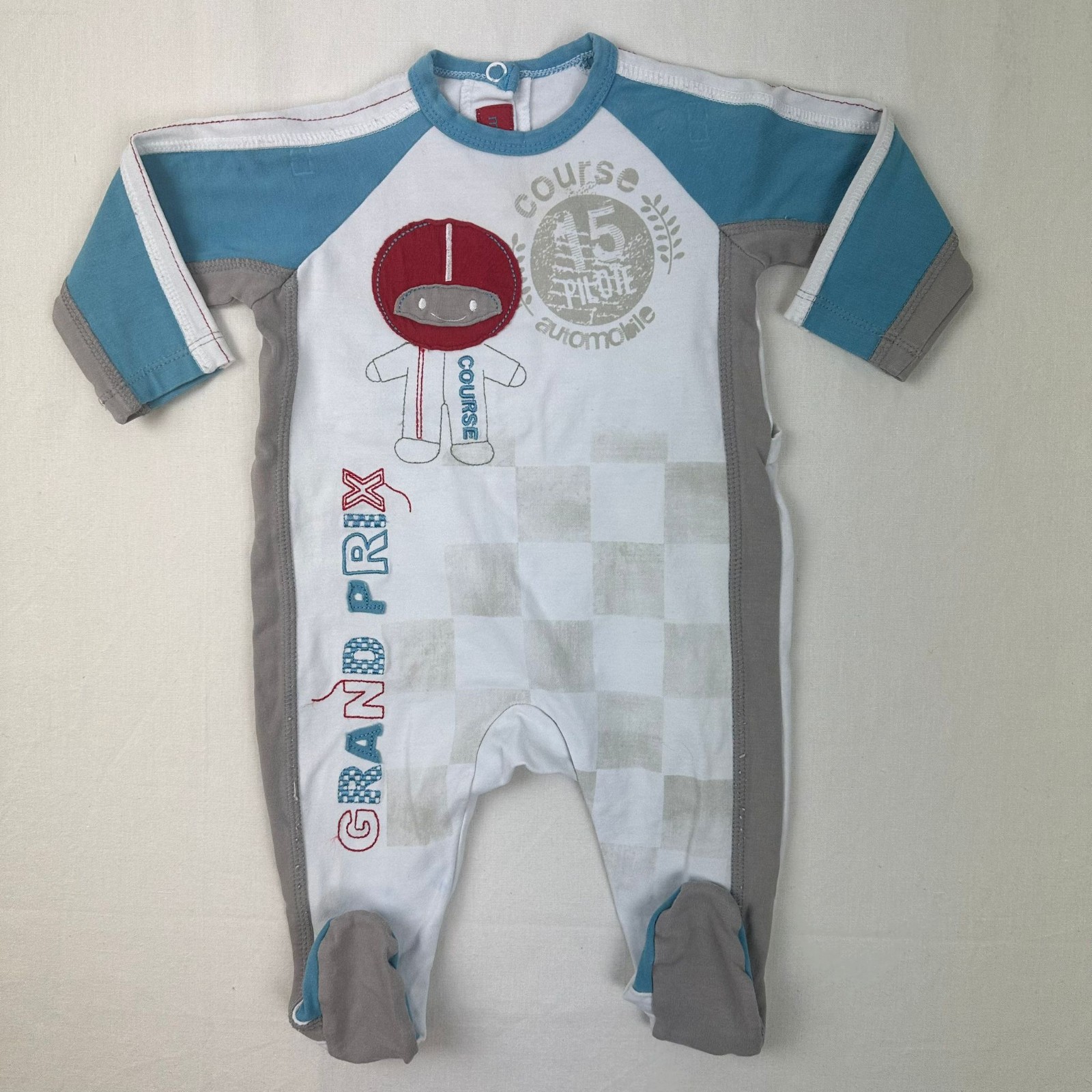 Autres commentaires : 5% elasthanne. Combinaison longue blanche manches longues bleu avec pieds bleu avec motif « cours automobile », un casque et une fermeture au dos par boutons pressions. Petit défaut: 2 tâches bleu dérrière sur la jambe droite de la combinaison. Niveau réduit de Fraise à Myrtille.