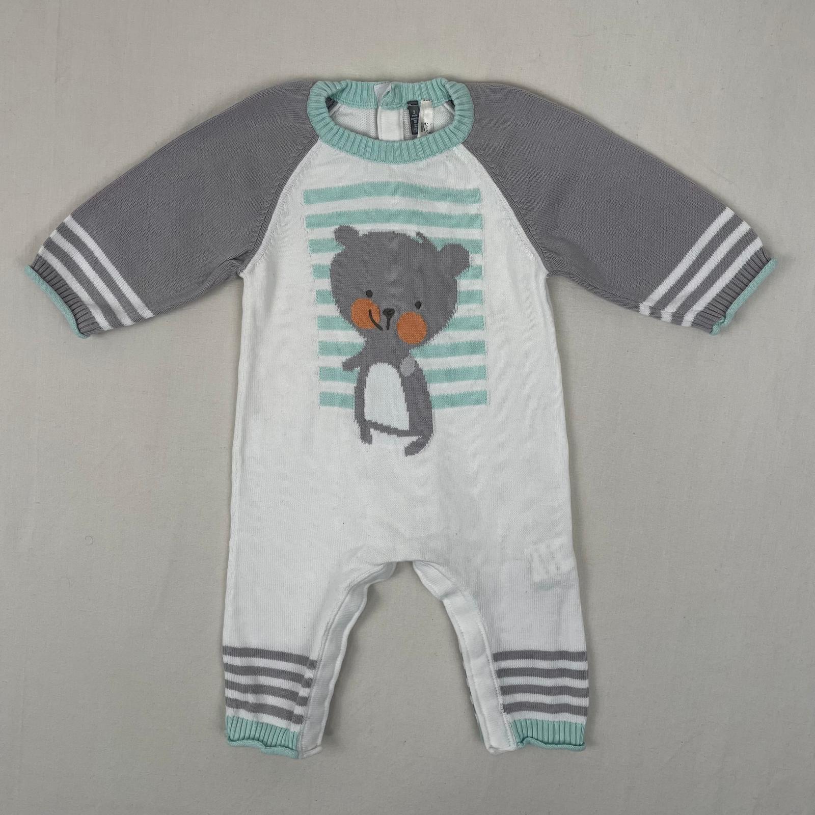 Combinaison en maille blanche avec manches longues grises, col et motif turquoise, avec un ours gris. boutons pressions dans le dos et à l’entre-jambe.