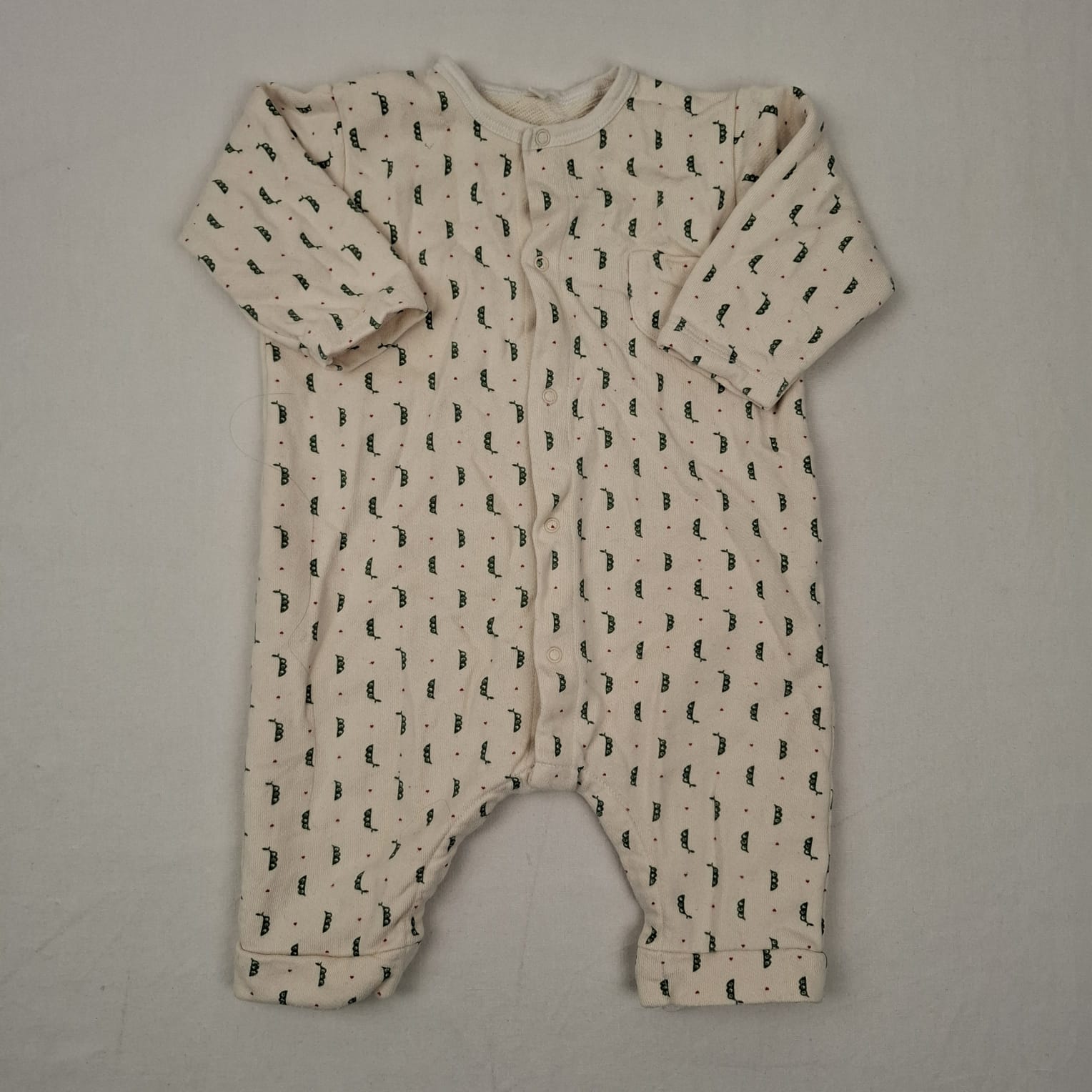 Autres commentaires : Combinaison longue en molleton beige clair, motifs les cosses de petits pois, col rond, fermeture par boutons pression devant et à l’entrejambe.