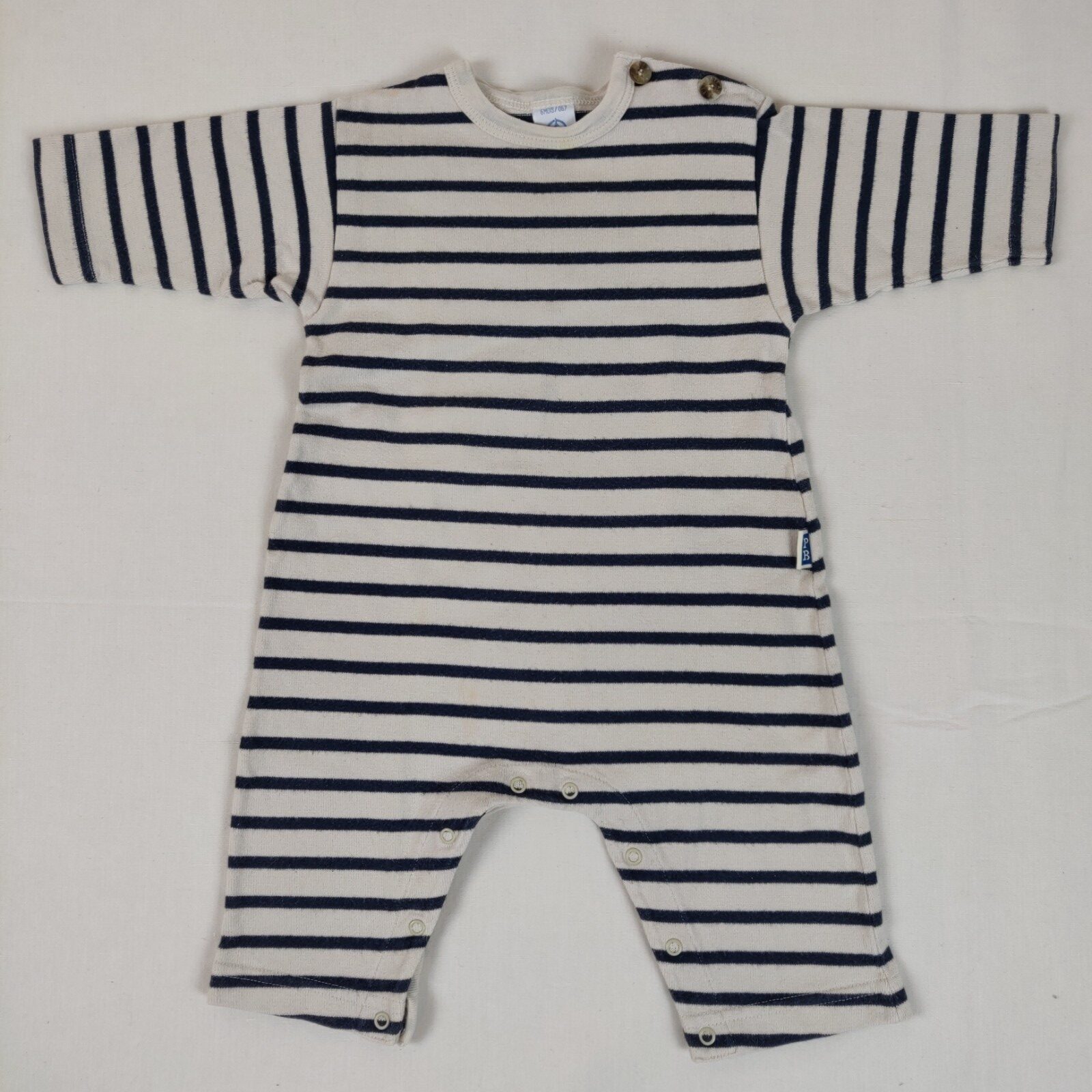 Autres commentaires : Combinaison longues à manches et sans pied – beige rayé bleu marine.Ouverture latérale à 2 boutons. Ouverture à l’entrejambe à pressions. 2 tâches orangées sur le devant. Niveau réduit de kiwi à myrtille.
