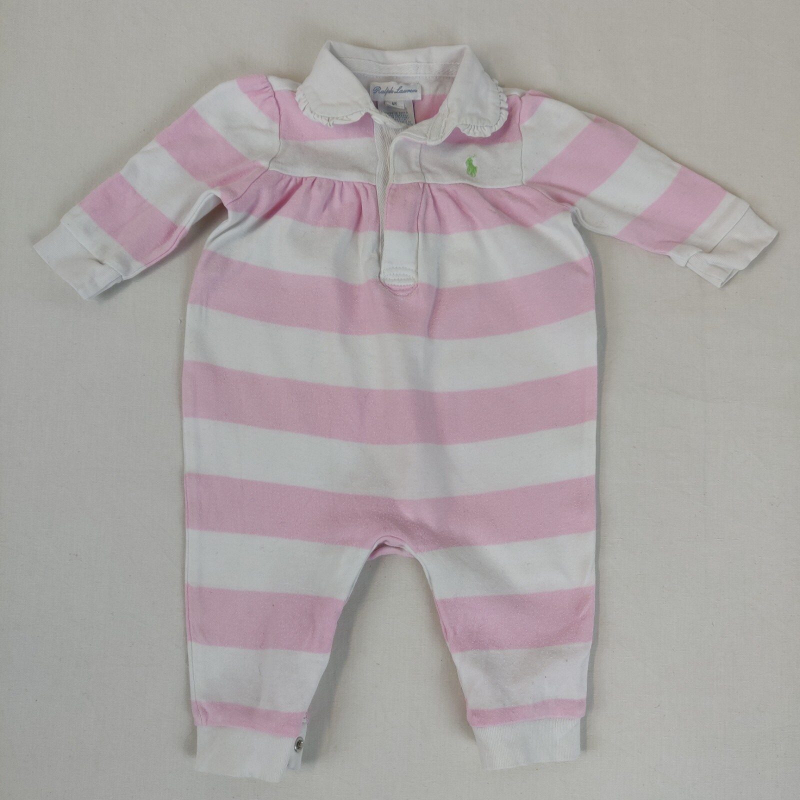 Autres commentaires : Combinaison longue à manches longues et sans pied à larges rayures blanches et roses. Col claudine avec bordure froncée. Ouverture centrale à 3 boutons. Ouverture à l’entrejambe à pressions. Usure normale du vêtement.