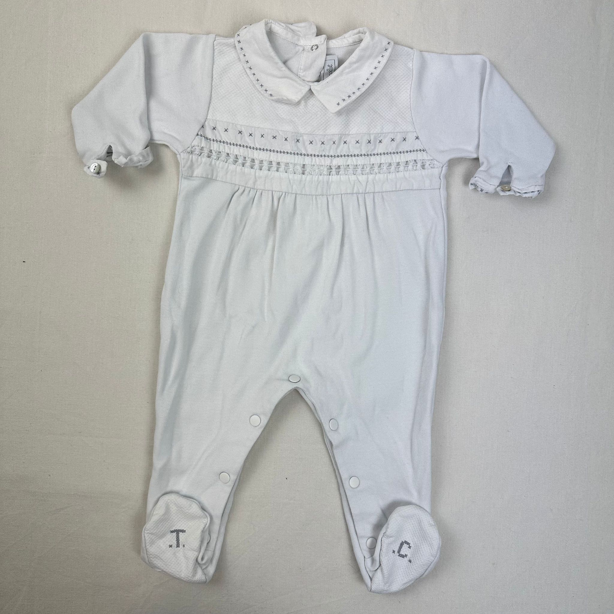 Autres commentaires : Combinaison longue manches longues blanche avec col claudine et une fermeture au dos par boutons pressions.