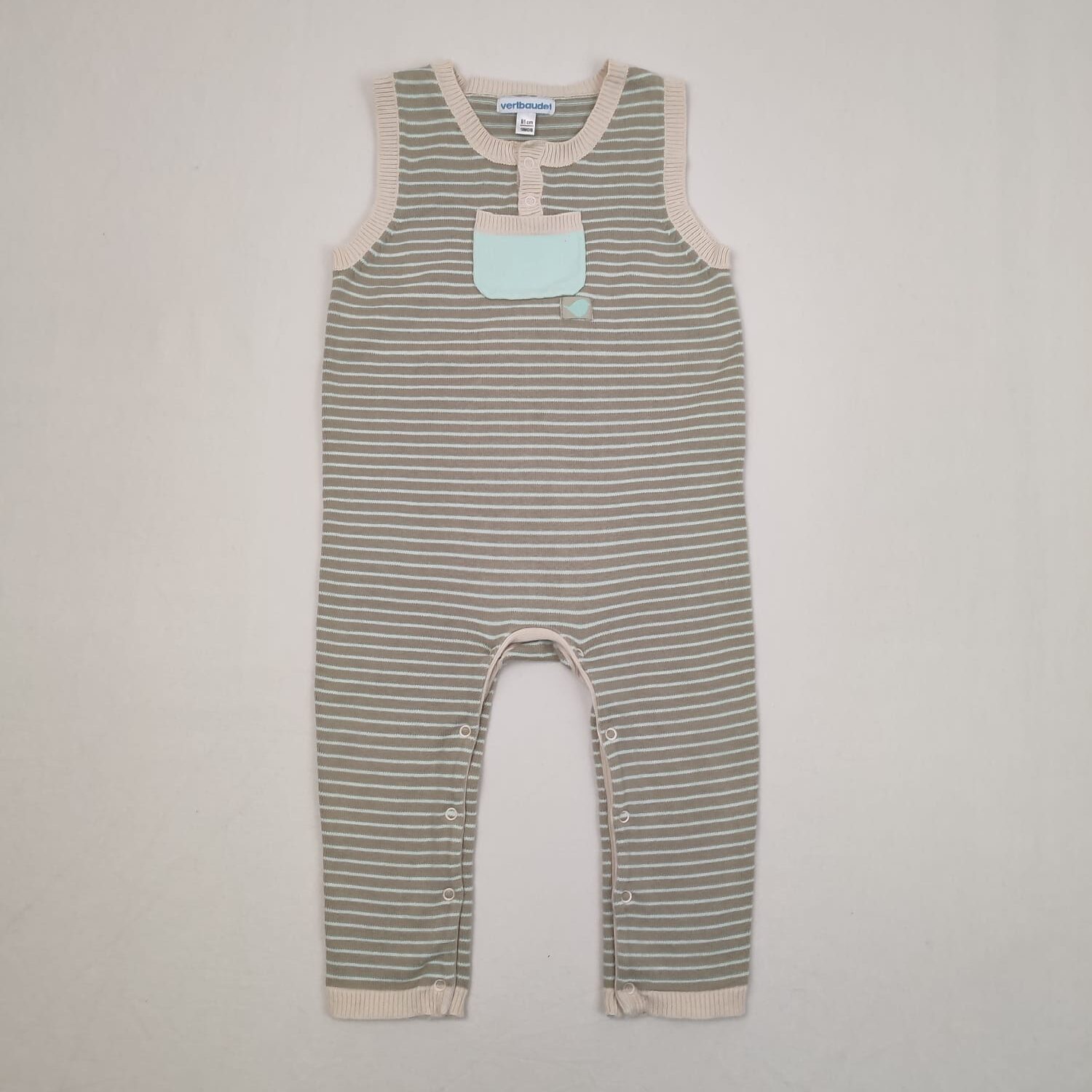 Autres commentaires : Combinaison longue sans manches et sans-pieds, en maille couleur taupe à rayures bleu clair, chevilles, poche, emmanchures et encolures côtelées beige rosé, fermeture par boutons pression au niveau de l’encolure et à l’entrejambe.