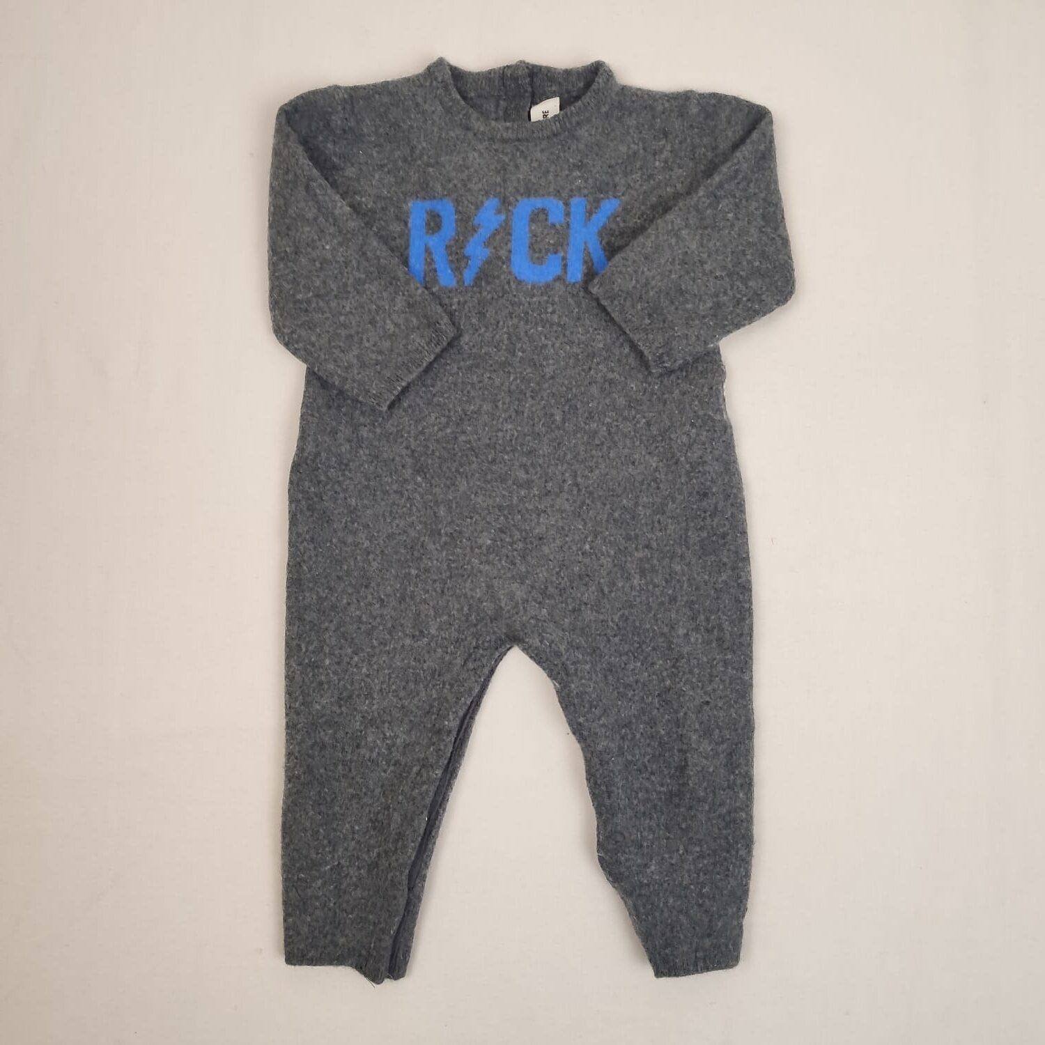 Autres commentaires : 5% cachemire. Pyjama 1 pièce gris sans pieds, style laine bouillie, inscription devant en bleu « ROCK » avec le O remplacée par un éclair, fermeture par boutons pression en haut du dos et à l’entrejambe