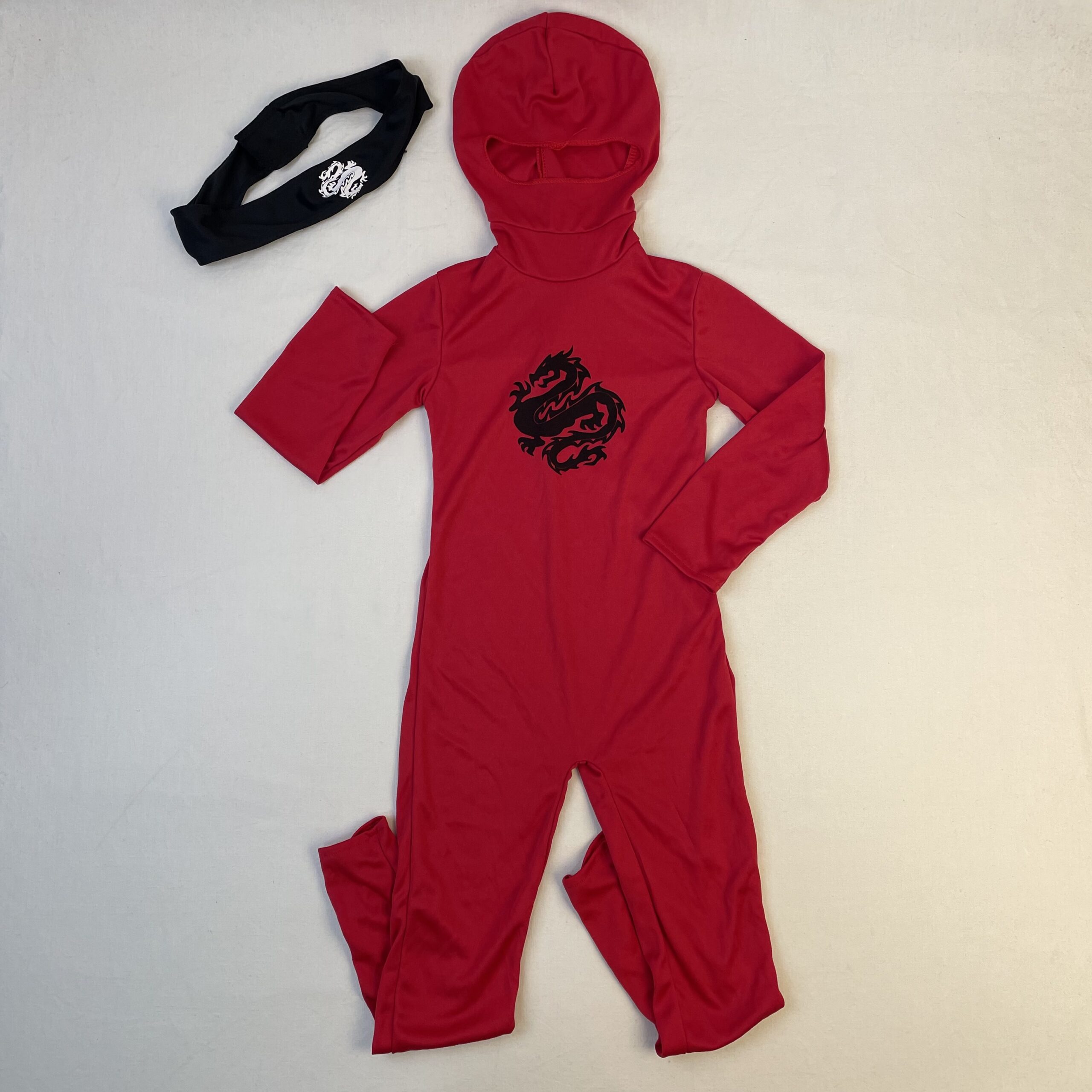 - Déguisement de Ninja incluant une combinaison rouge avec capuche et un bandeau noir à scratch.