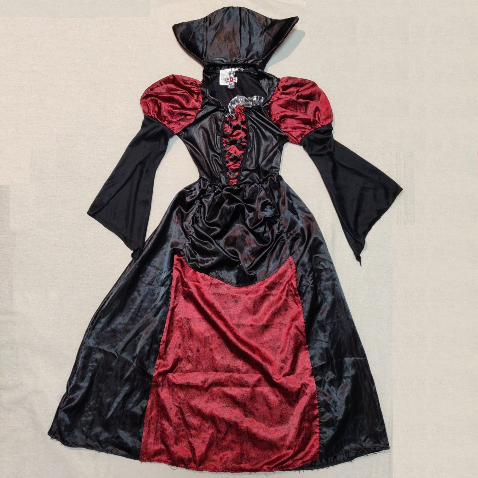 Autres commentaires : Déguisement de sorcière, noir et bordeaux. Les parties en satin bordeaux contiennent des toiles d’araignées. Tour de cou avec croix en collier de chien. Deux petits taches violettes sur la jupe, n’altèrent pas du tout l’aspect de la robe. Taille indiquée 4 à 6 ans mais taille très grand !