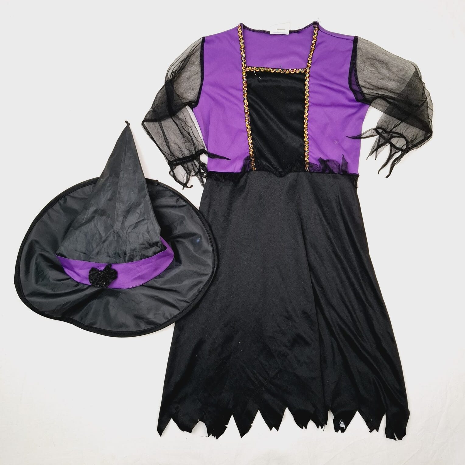 Autres commentaires : Déguisement de sorcière avec chapeau, manches longues transparentes, Petit défaut: petit trou au niveau du chapeau.