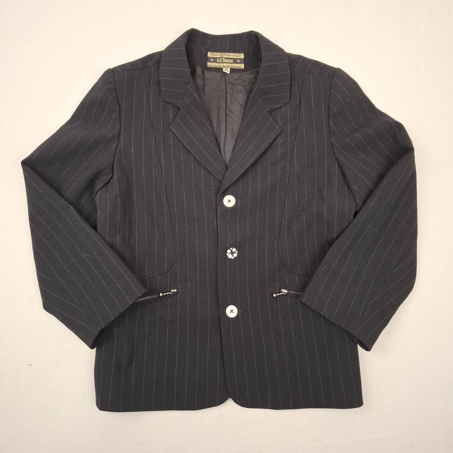 Autres commentaires : 44% laine, 2% élasthanne. Blazer noir à rayures grises foncé, fermeture par 3 boutons.