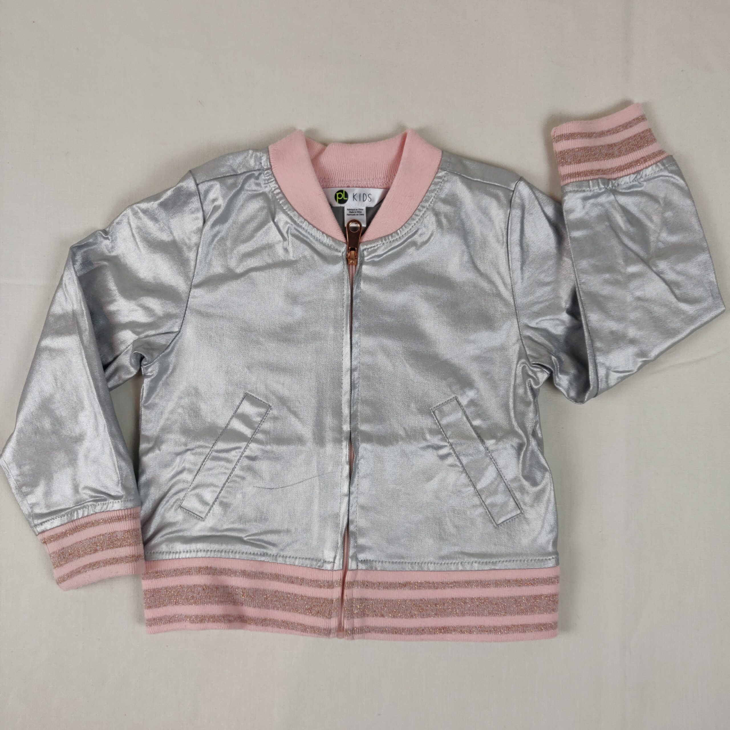 Autres commentaires : 3% Elasthanne. Doublure 100% Polyester. Blouson – argent avec col, poignets et taille élastiques de couleur rose avec des inserts brillants. 2 poches avant centrales trompe-l’oeil. Fermeture par zip rose. Taille assez grand. Petit accro léger sur l’avant.