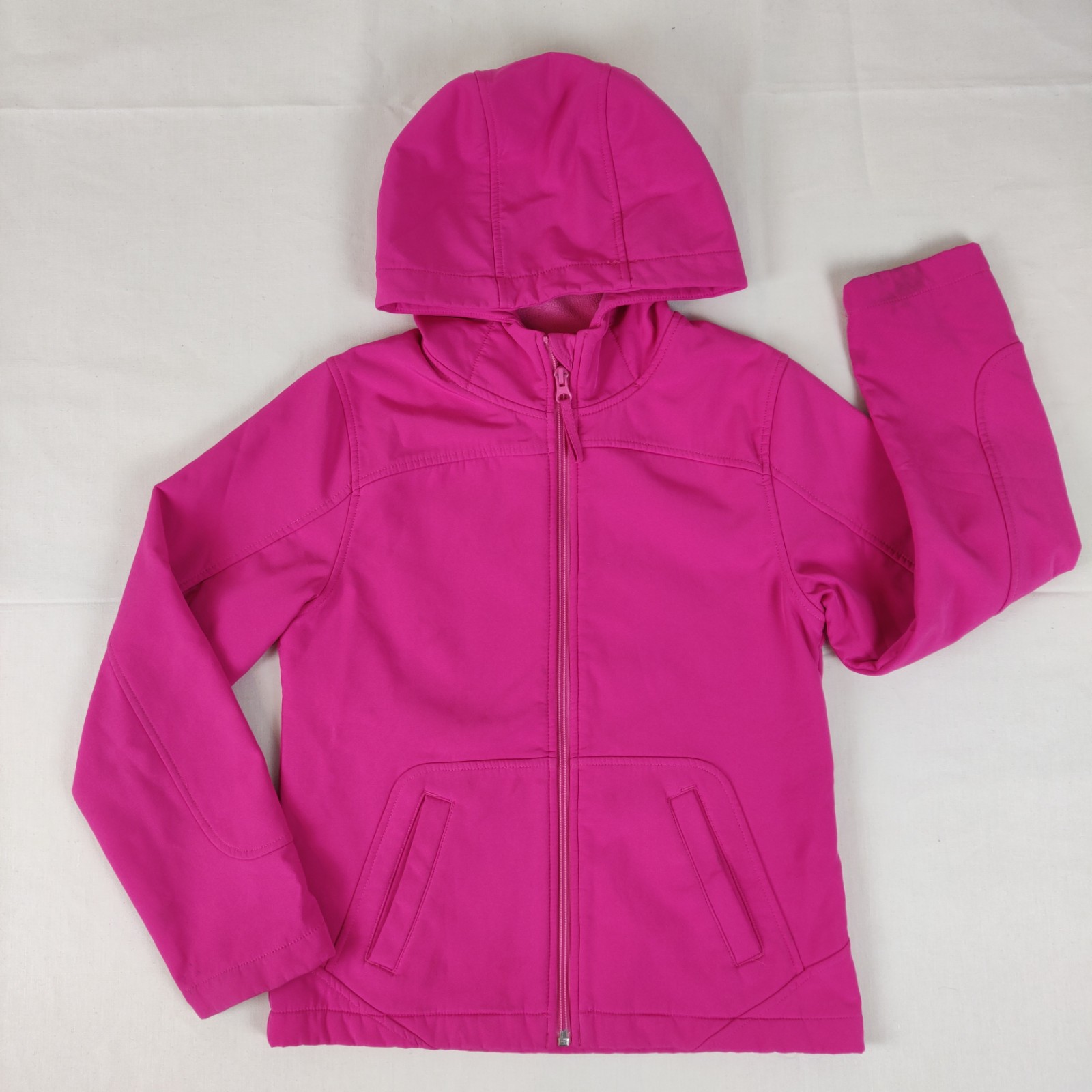 Autres commentaires : 6% spandex. Doublure polaire rose 100% polyester. Blouson sans marque rose fuschia à capuche avec fermeture éclair centrale. 2 poches latérales. Petit accro dans le dos. Petites tâches au niveau de la poche gauche et la taille. Tâche au niveau de la manche.