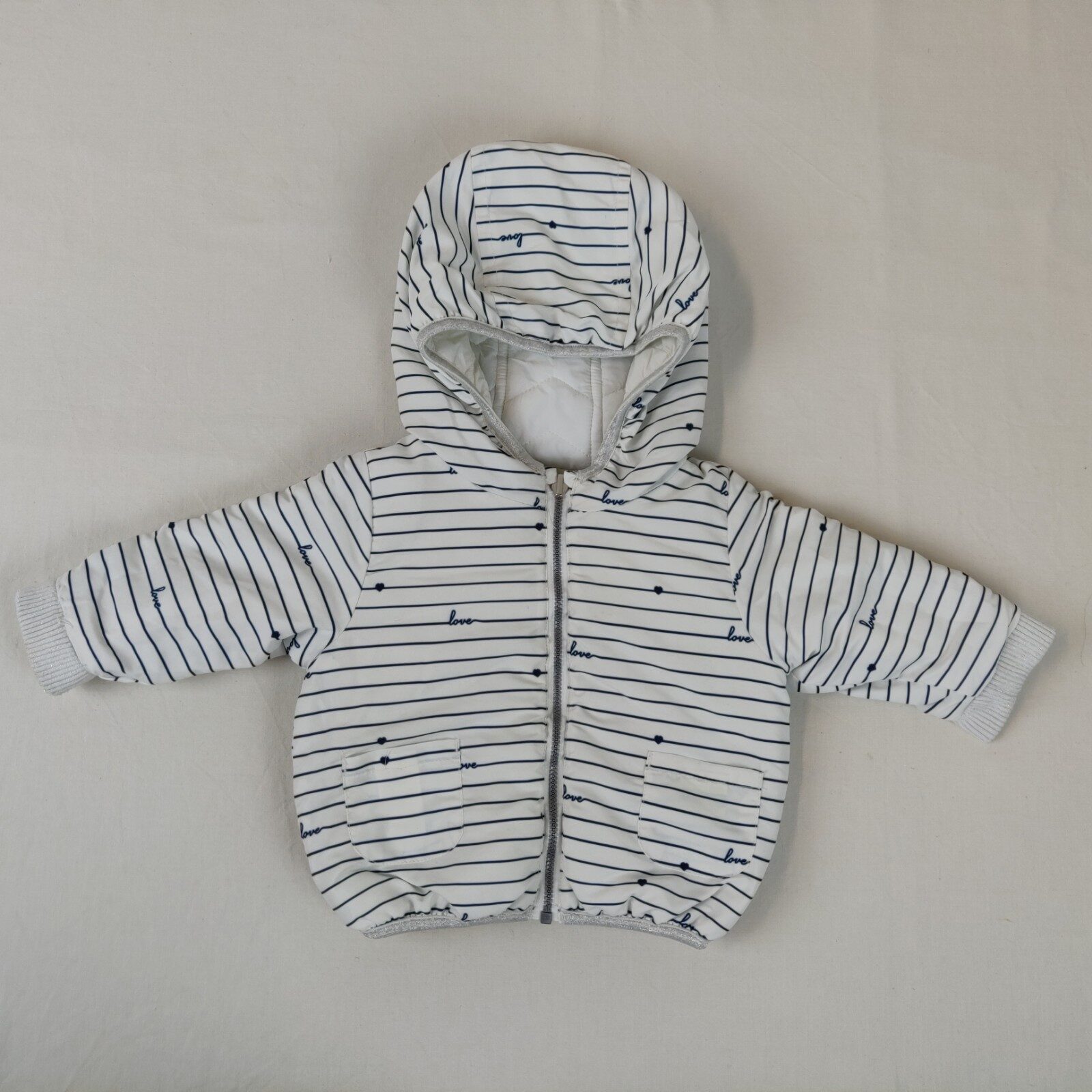 Autres commentaires : Blouson blanc à rayures horizontales bleu foncées avec capuche et reversible.