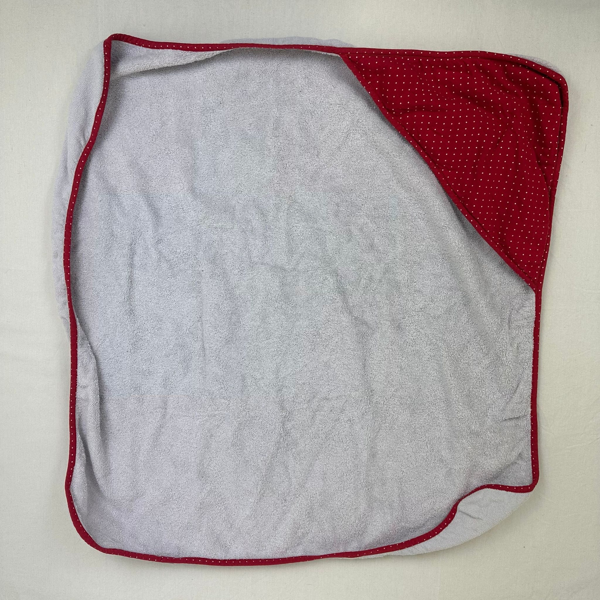 Autres commentaires : 3% polyester. Cape de bain blanc avec bordures rouges.