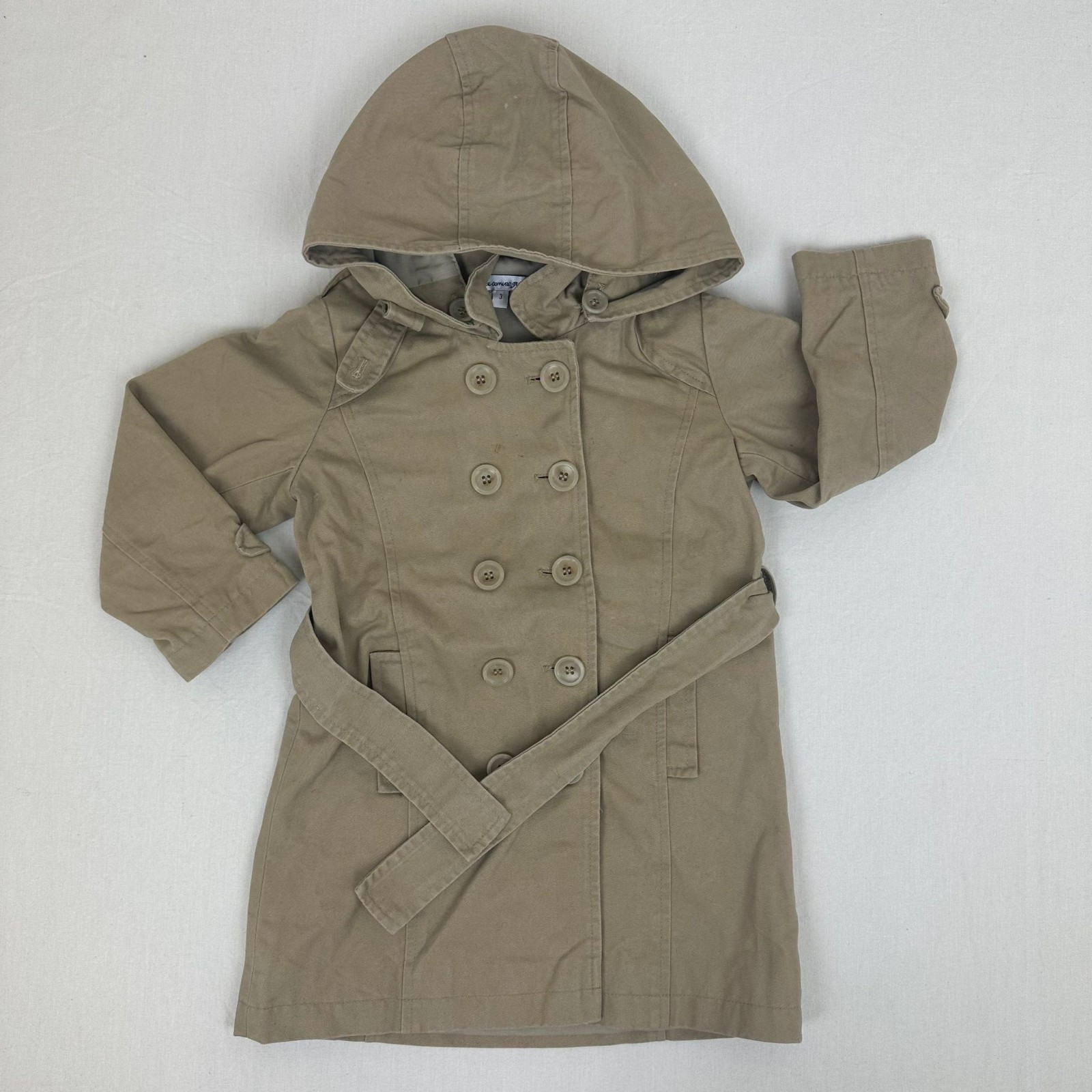 Autres commentaires : Trench marron clair avec capuche amovible et une fermeture devant par boutons et par cordon au niveau de la taille. Petit défaut: petite tâche marron. Niveau reduit de Kiwi à Fraise.