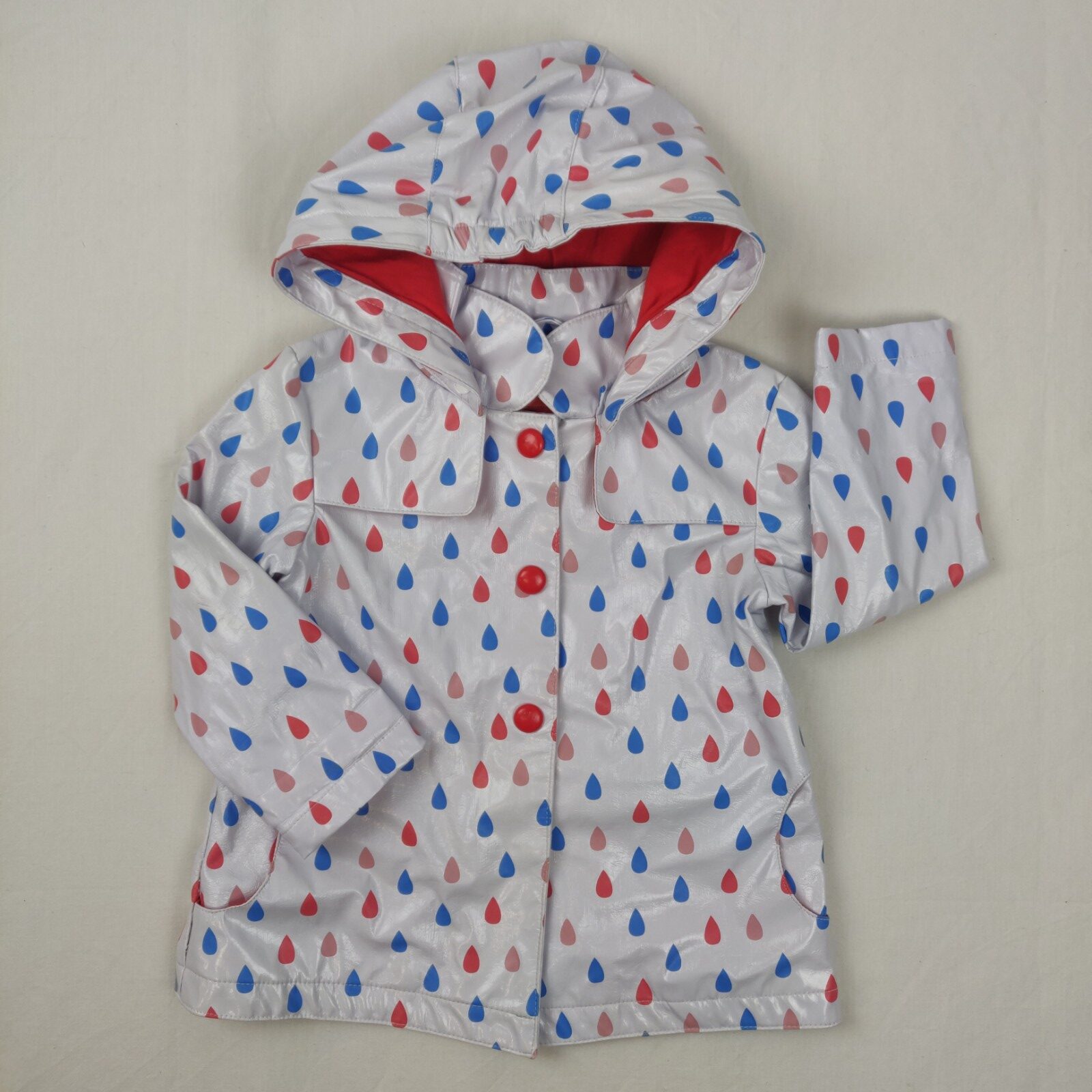 Autres commentaires : Impérméable à capuche amovible blanc avec motif des gouttes rouge et bleu, 2 poches latérales et une fermeture par boutons pressions. Doublure 100% coton.