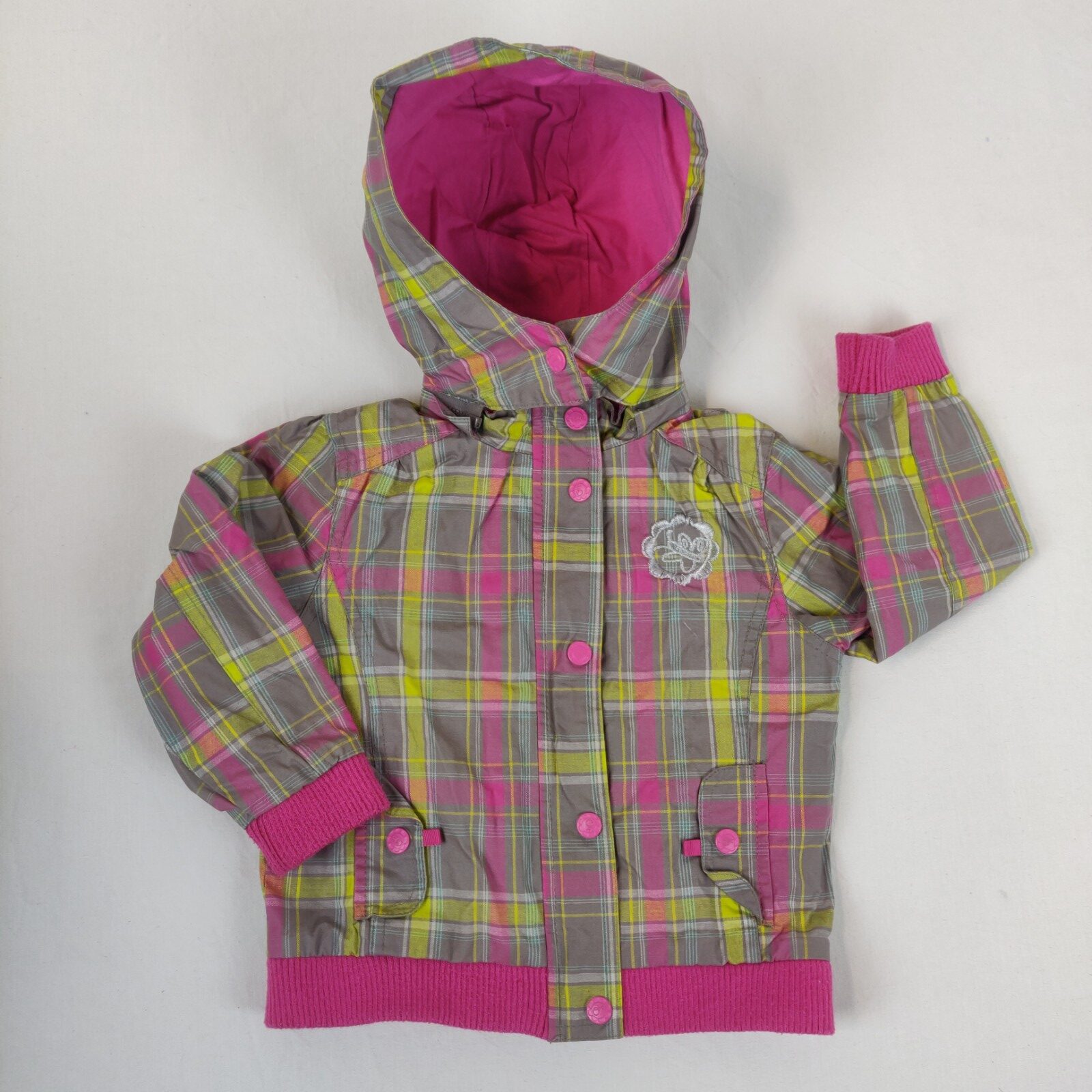 Autres commentaires : Veste de pluie à capuche amovible doublée à carreaux marrons, jaunes, verts, beiges et rose. Ouverture centrale à boutons. Motif central petit papillon argenté. 2 poches latérales à rabat. Usure normale.