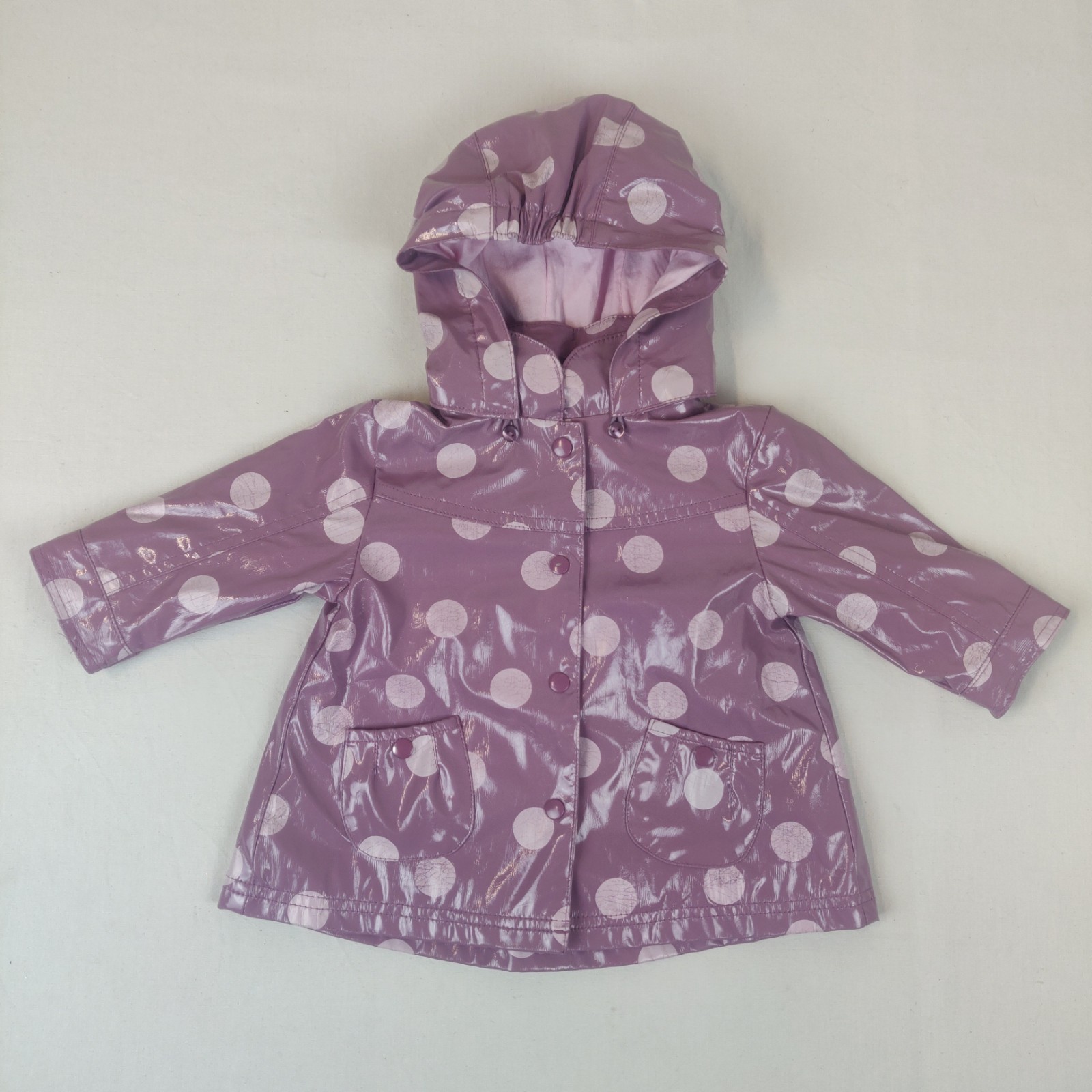 Autres commentaires : Imperméable violet à ronds rose avec fermeture à boutons pression à l’avant et poches.