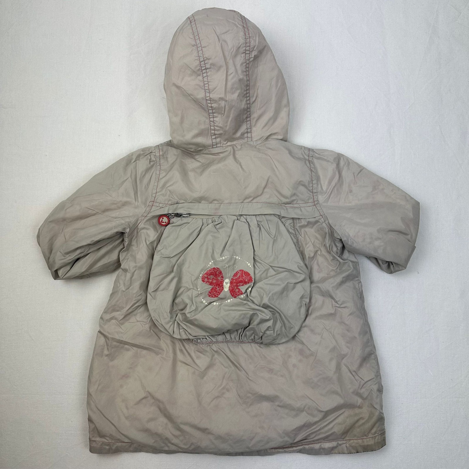 Autres commentaires : Impérméable à capuche beige avec motif les filaments rouges, intérieur en liberty le dos un papillon rouge et contient une poche fermé en zip, 2 poches latérales et une fermeture par boutons pressions. Doublure 100% coton.