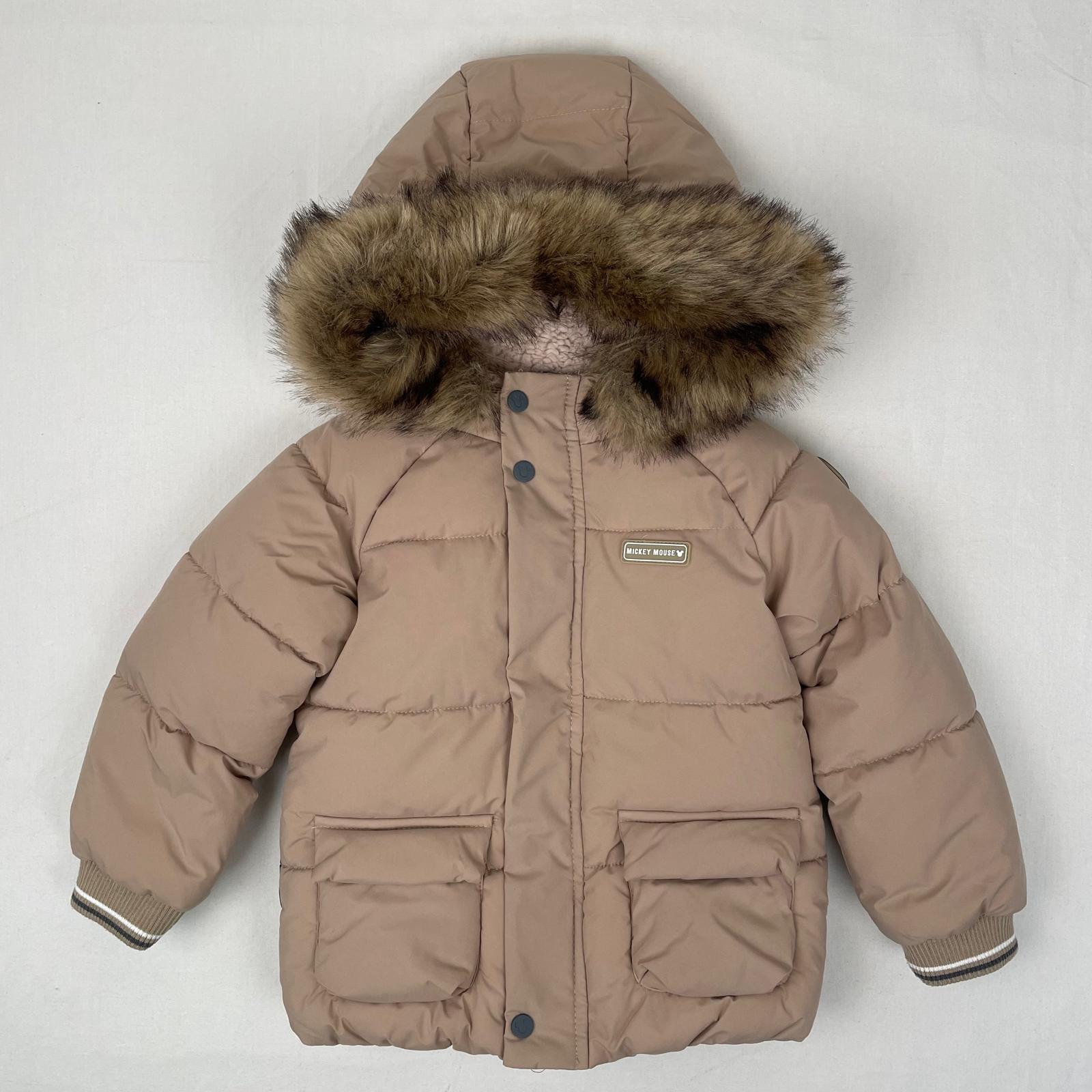 Autres commentaires : Parka longue épaisse rembourrée avec fermeture éclair et boutons pression, poches devant, fourrure sur la capuche retirable, imprimé mickey derrière à droite, manches élastiquées.