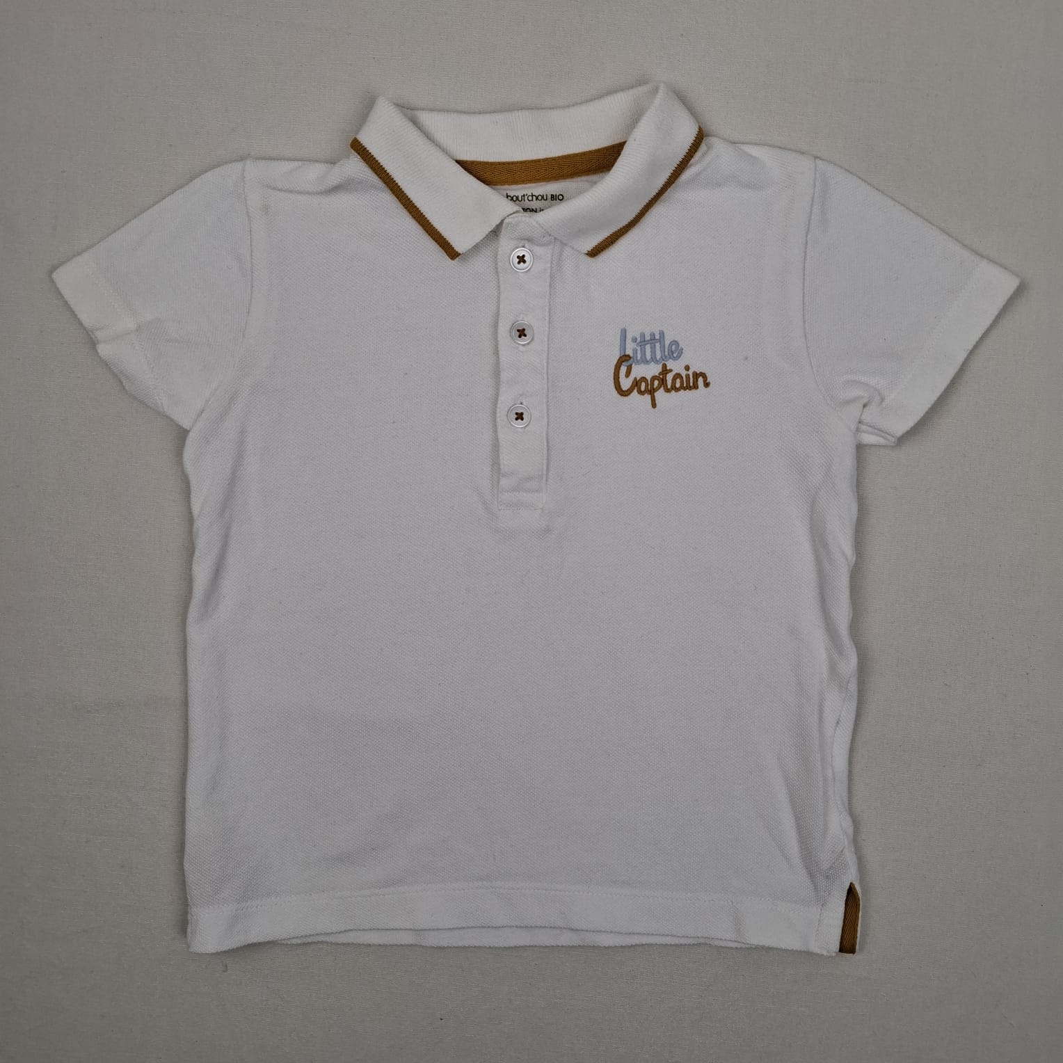 Autres commentaires : Polo manches courtes blanc Bout’chou Bio, fermeture par boutons au niveau du col devant, inscription « little captain » sur le devant.