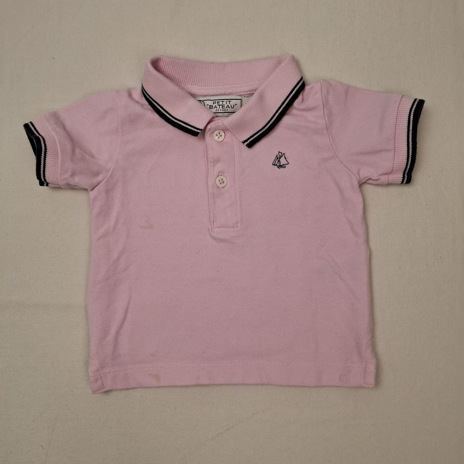 Autres commentaires : Polo rose à manches courtes, fermeture devant par boutons avec des rayures noires, petites taches devant .