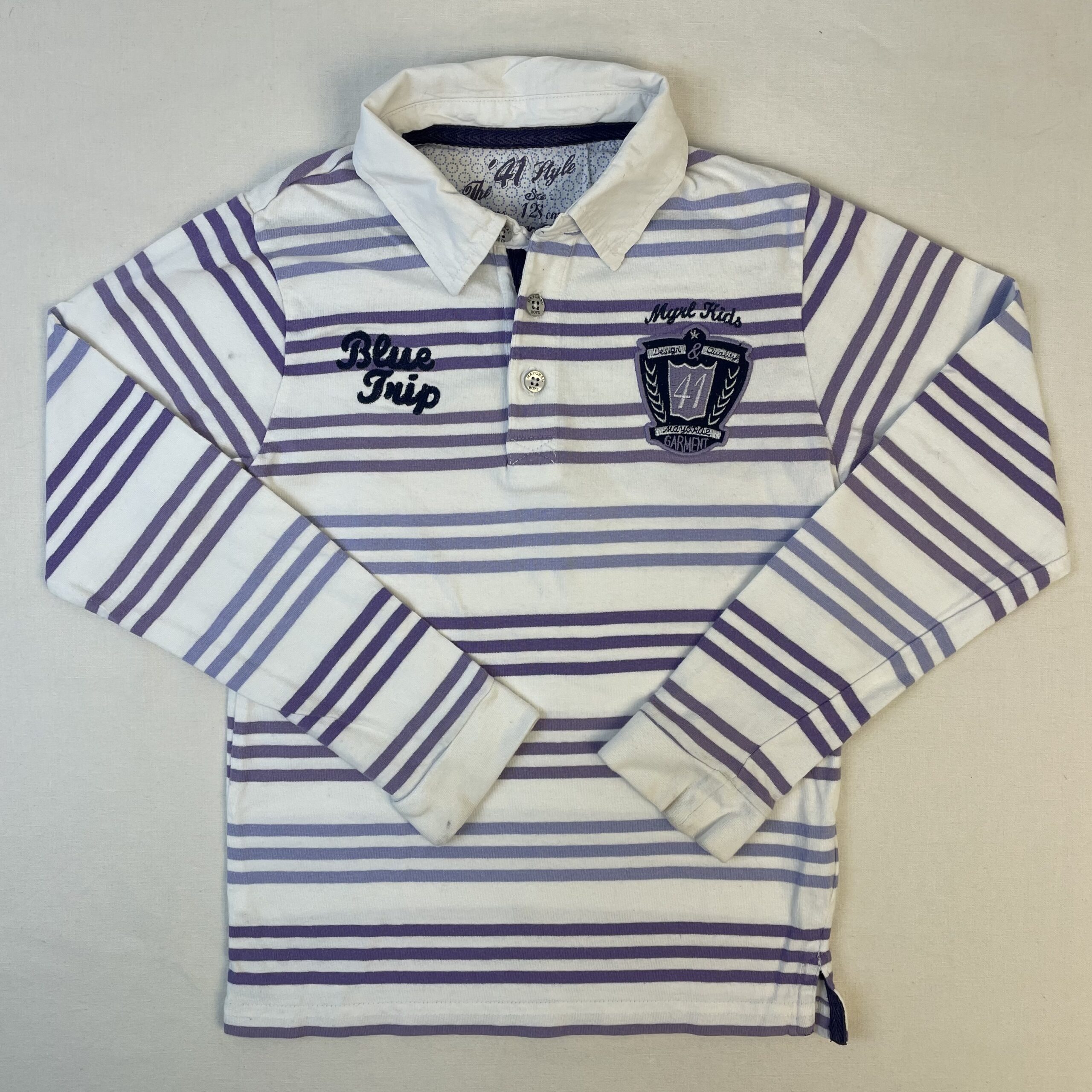 - Polo manches longues blanc à rayures violettes et couleur lavande, devant blason bleu marine et mauve cousu, boutonnage classique devant, inscription cousue au dos « tour de Méditerranée » en bleu nuit et violet. Petit défaut : quelques taches à l’arrière. Niveau réduit de Fraise à Myrtille.