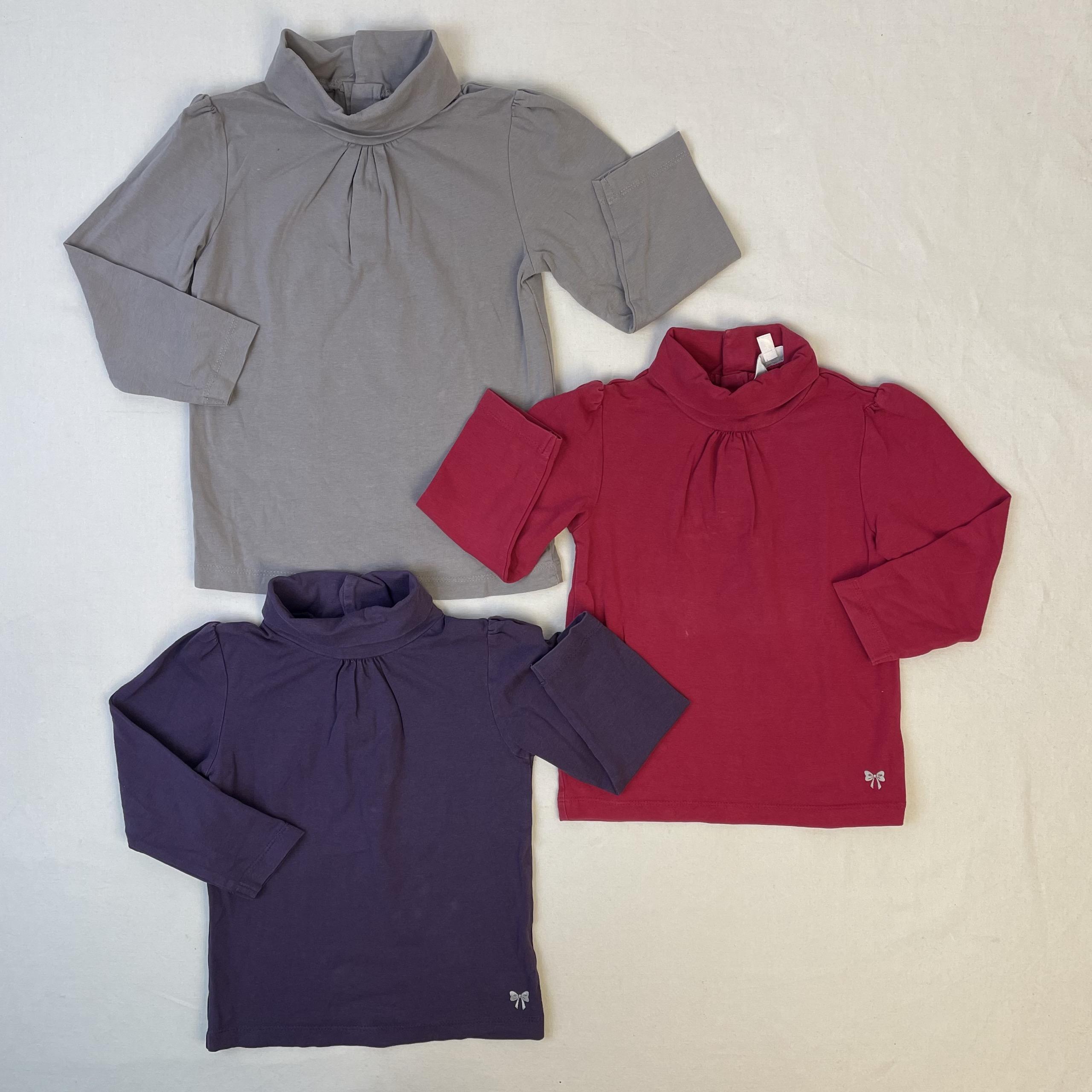 - lot de 3 t-shirts col roulé couleur gris, rouge et violet, fermeture à l’arrière par boutons pressions