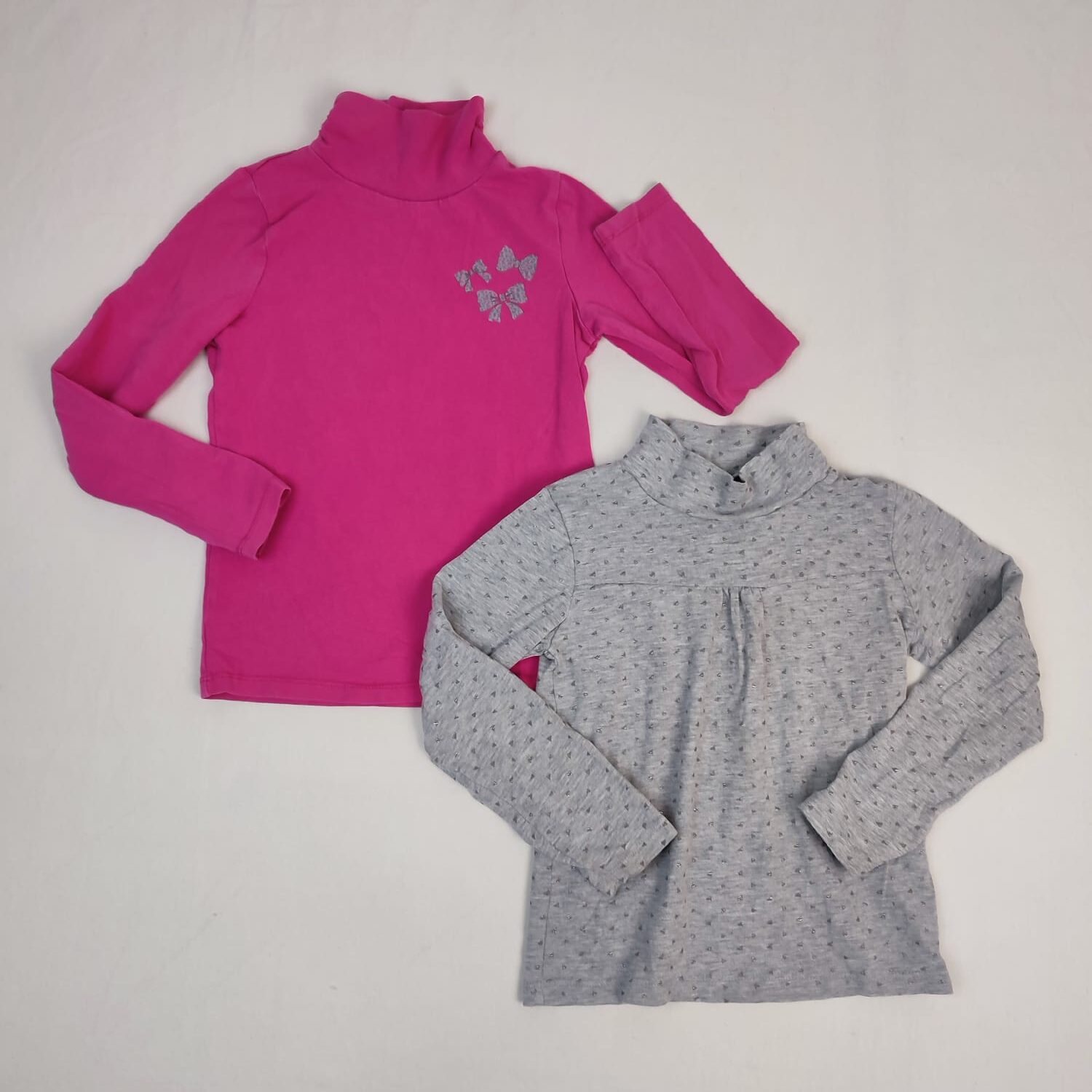 Autres commentaires : Lot de 2 t-shirts col roulé à manches longues : – 1 rose fuchsia Orchestra, légèrement froncé devant, motifs trois petits noeuds papillon gris, 5% élasthanne. – 1 gris de la marque Z, motis mini triangles argentés, 6% viscose, 3% élasthanne.