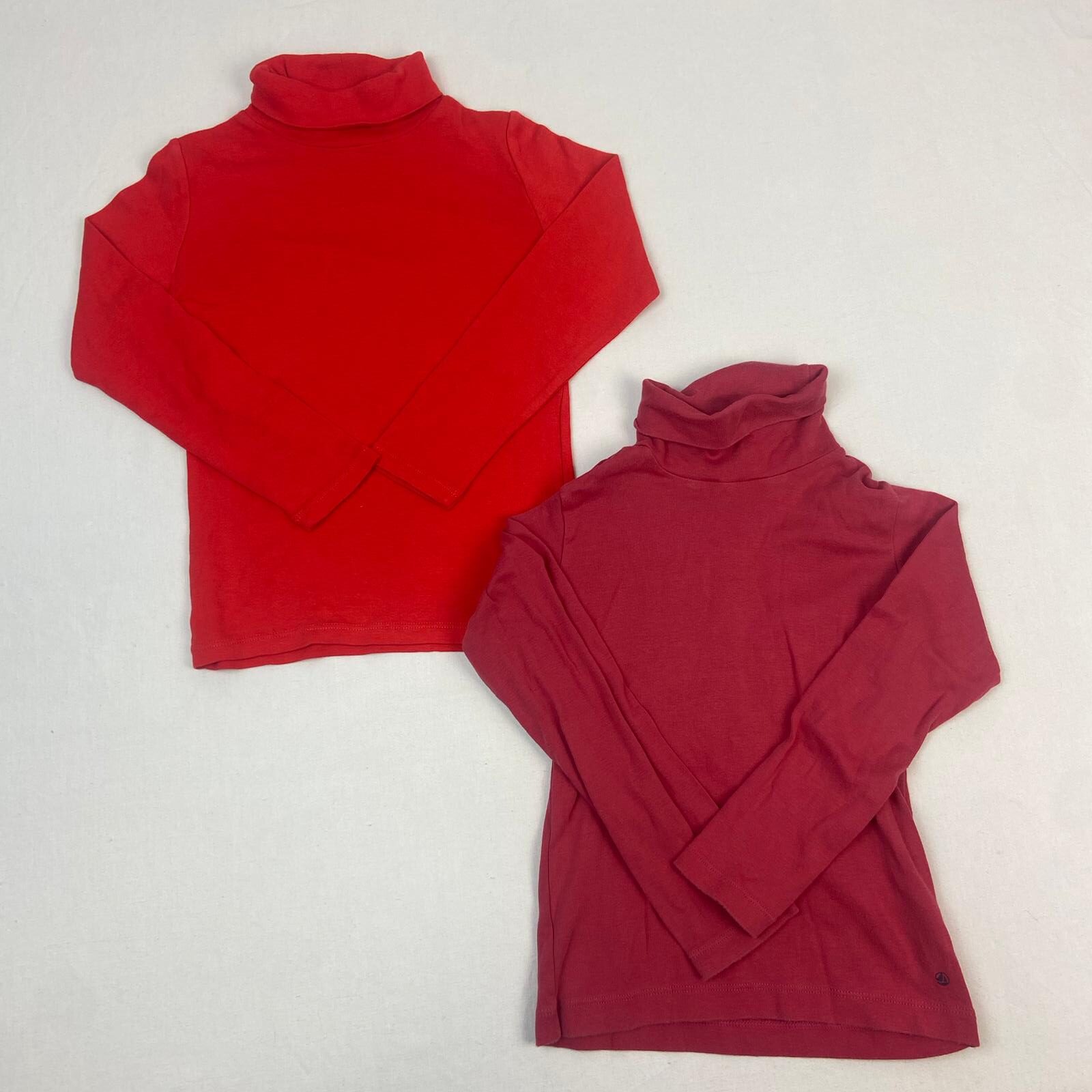 Autres commentaires : lot de 2 T-shirts à col roulé, un rouge rose Petit Bateau , couleur légèrement passée et un rouge orangé CFK. Niveau réduit de fraise à myrtille