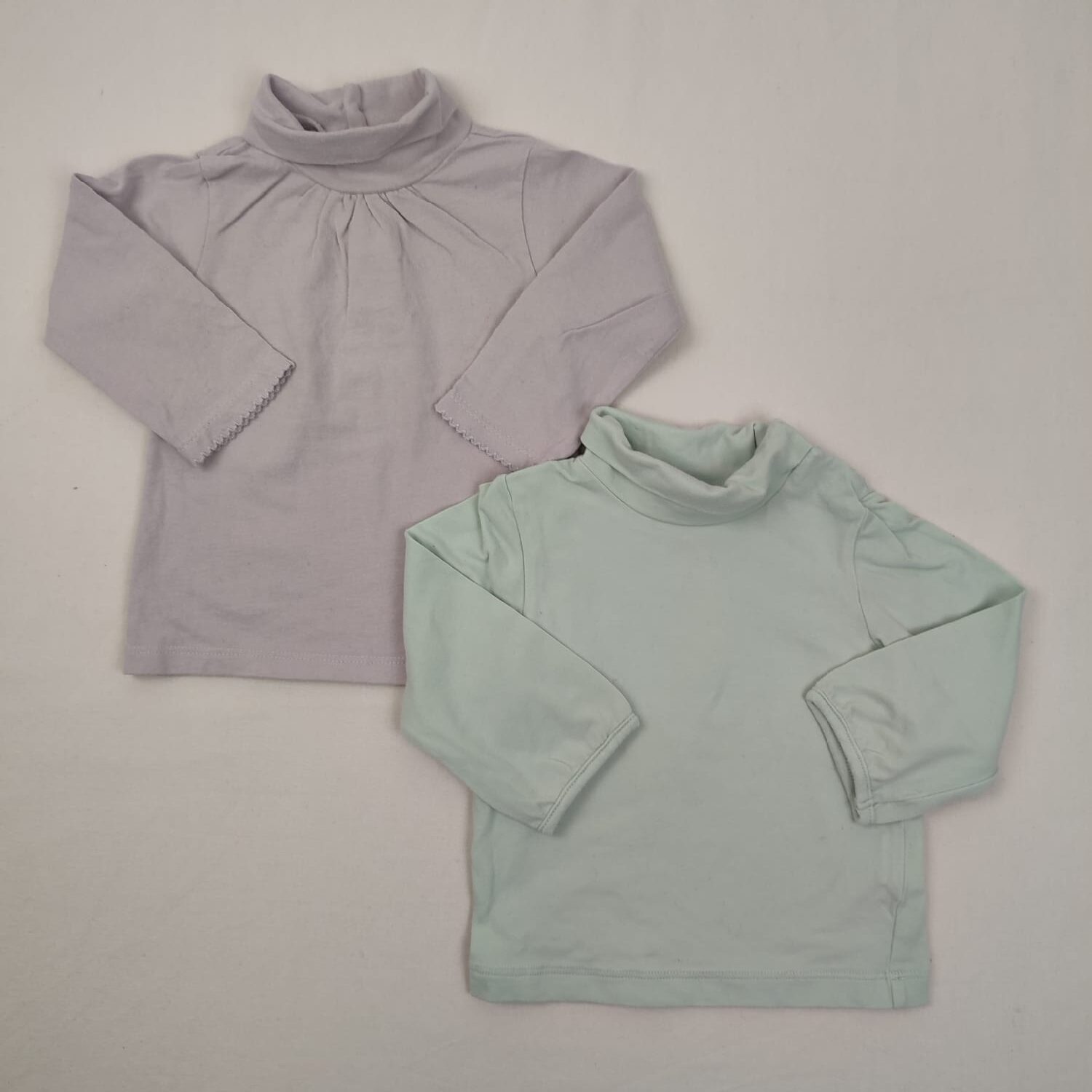 Autres commentaires : Lot de 2 t-shirts col roulé manches longues : – un vert d’eau TEX, manches légèrement élastiquées et froncées, fermeture par boutons pression àl’épaule, 96% coton et 4 élasthanne. – un beige DPAM, manche avec liseré dentelé, fermeture par boutons en haut du dos, 100% coton.
