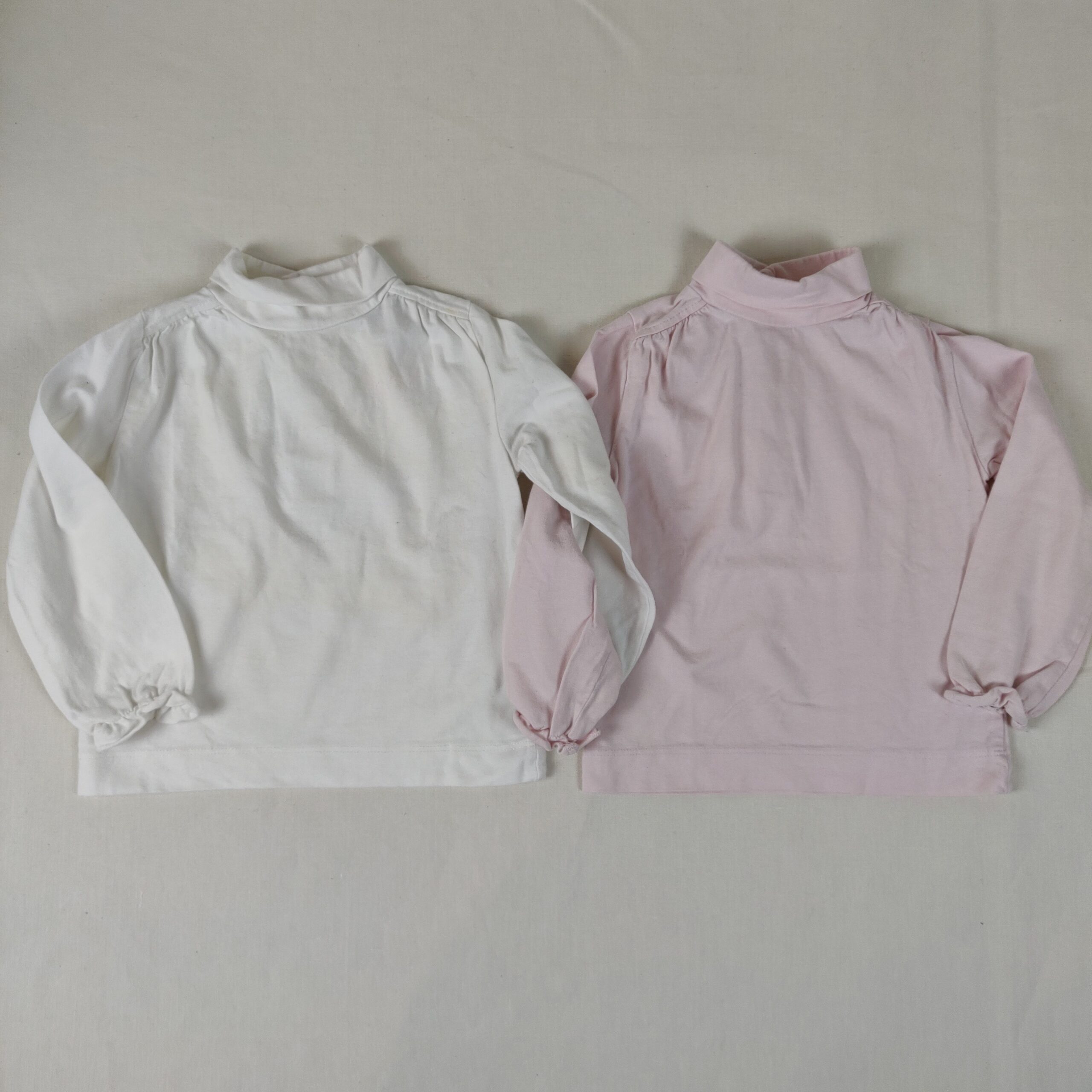 Autres commentaires : Lot de 2 t-shirts à col roulé, un blanc et un rose pâle. Le blanc présente de très légères traces jaunies, le rose est en parfait état. Fermés par 3 boutons pression au dos.