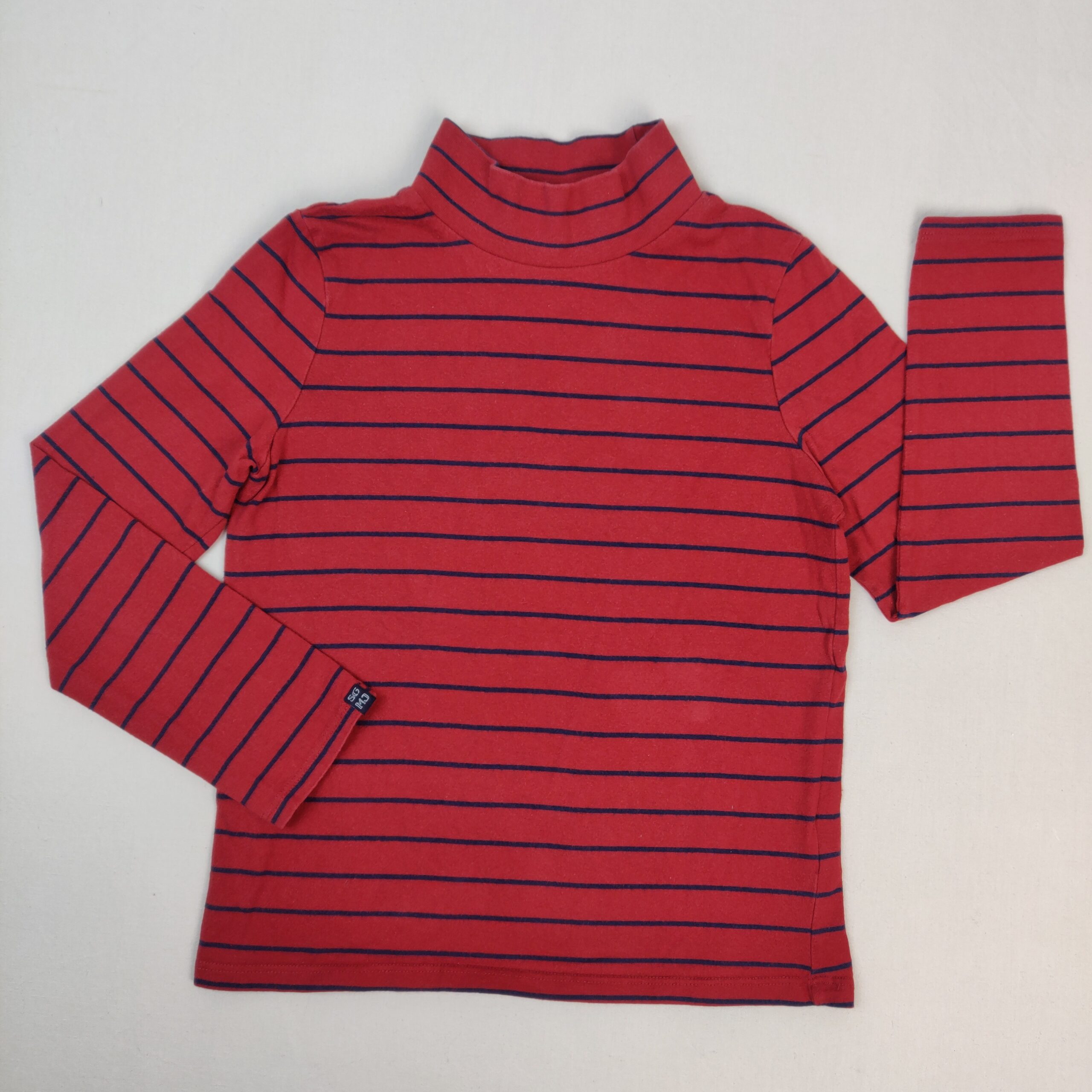 Autres commentaires : T-hsirt manches longues rouge, col cheminée, à rayures bleu foncé.