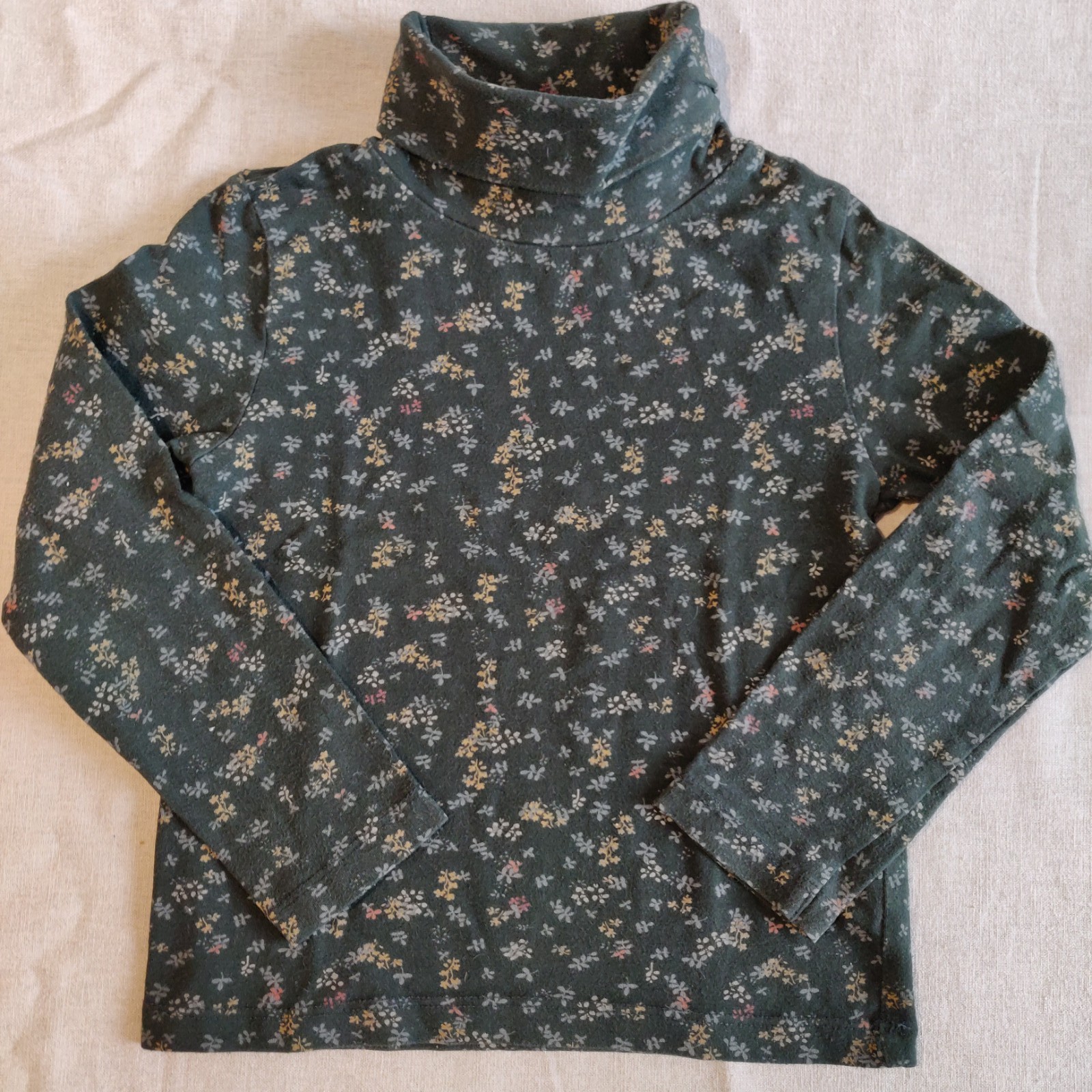 Autres commentaires : 8% Elasthanne. Sous-pull vert à petits feuilles vert d’eau, jaune et ocre, aux couleurs de l’automne.