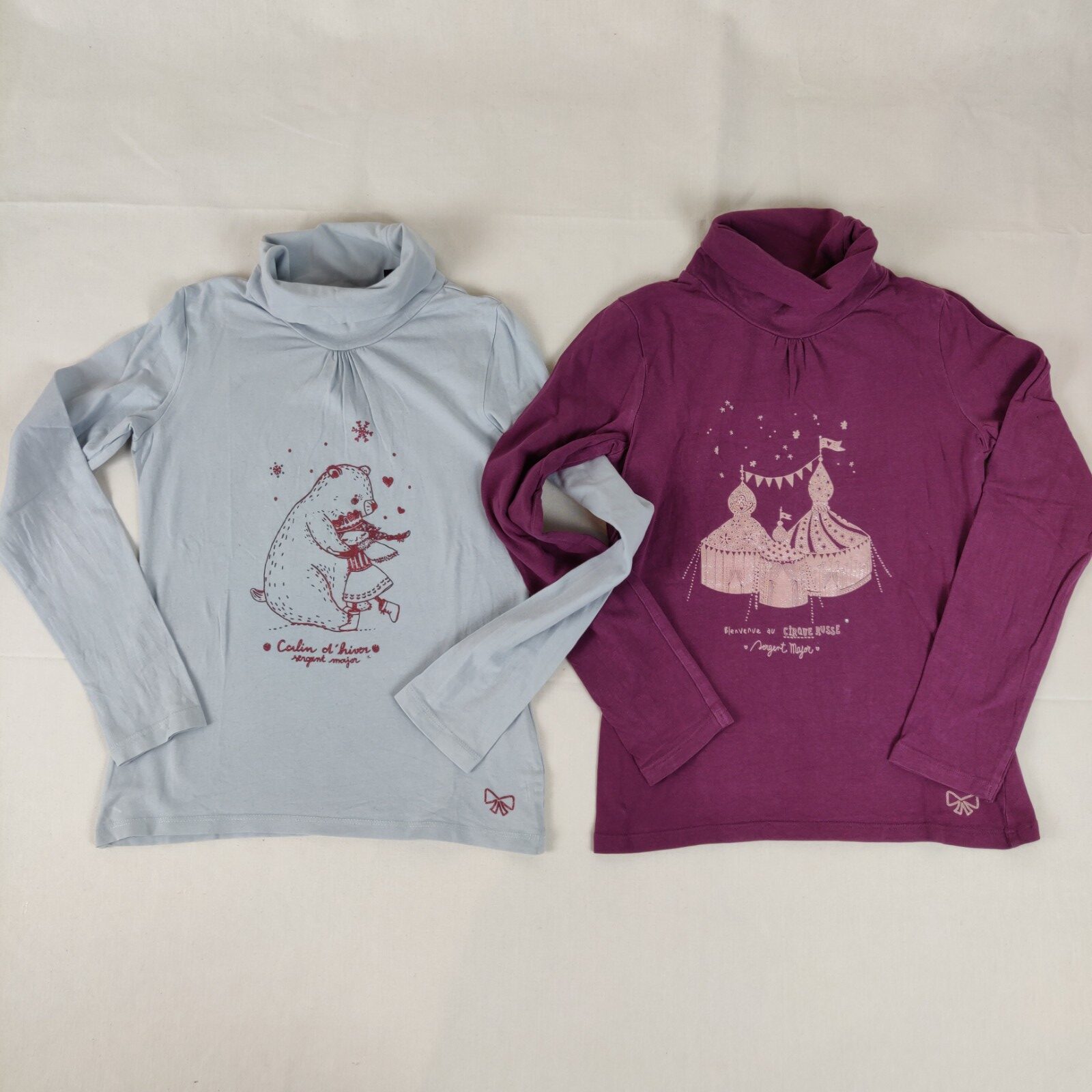 Autres commentaires : 5% élasthanne. Lot de 2 T-shirts manches longues et col roulé. Un T-shirt violet avec un motif chapiteau rose pailleté et inscription « Bienvenue au cirque russe ». Un T-shirt bleu clair avec motif pailleté cuivré ourson et petite fille avec inscription « Calin d’hiver ».