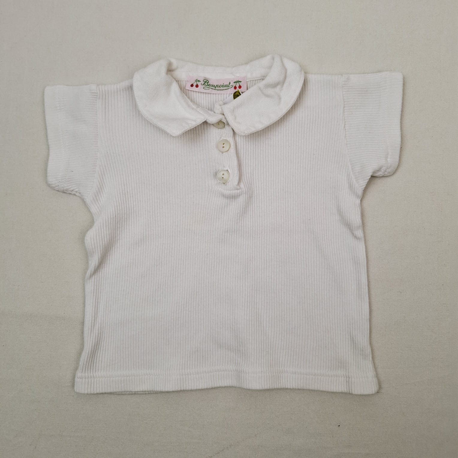 Autres commentaires : T-shirt blanc côtelé à manches courtes, col polo, fermeture par boutons.
