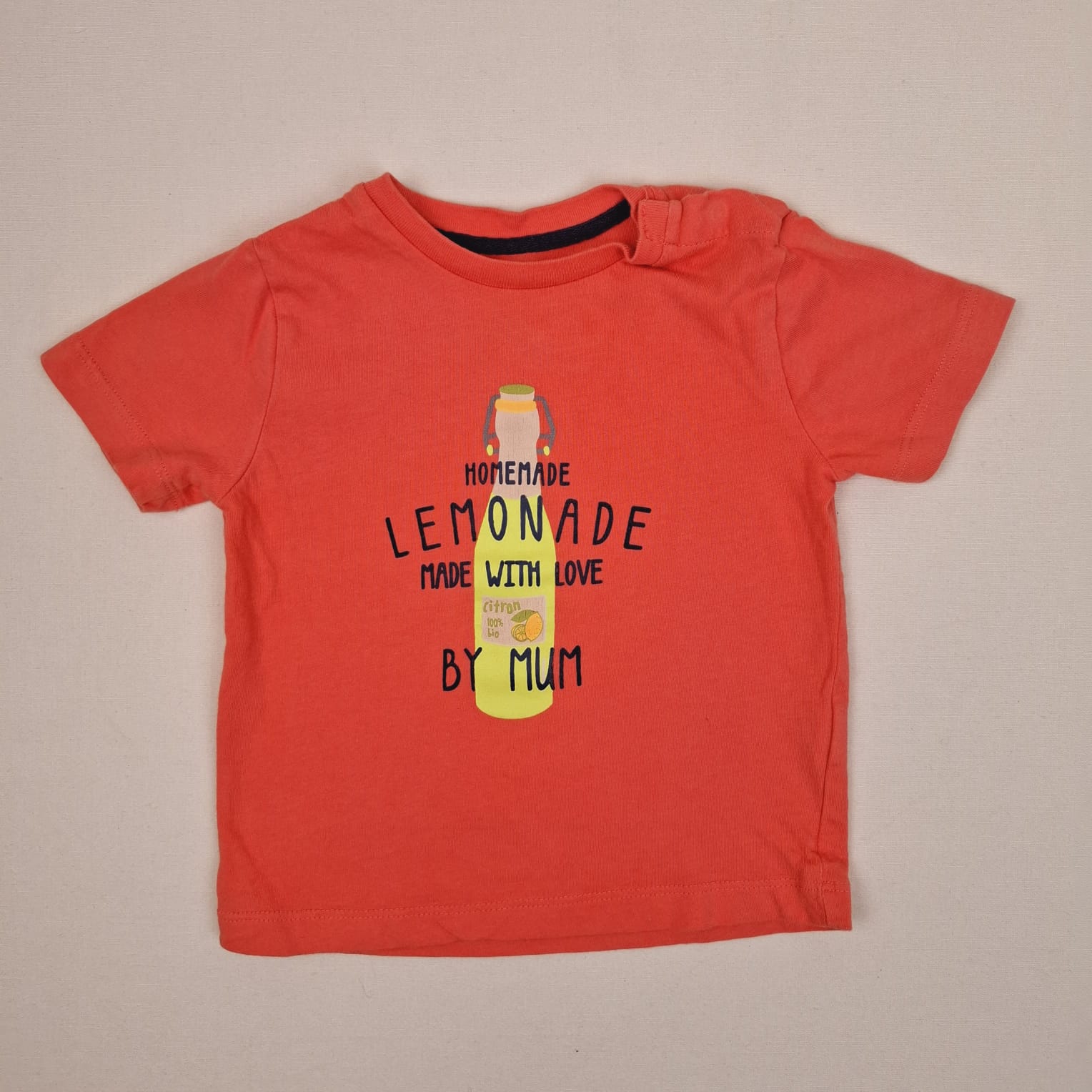Autres commentaires : T-shirt manches courtes Bout’chou 12M orange avec dessin et inscription de limonade à l’avant