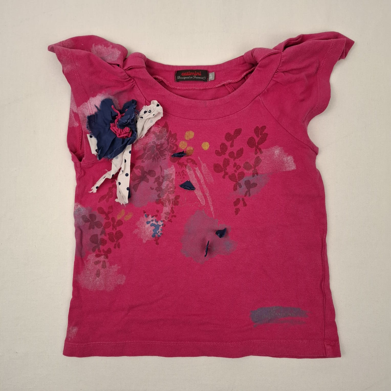 Autres commentaires : T-shirt rose fushia à manches courtes, col rond, motid fleuri, effet usé.