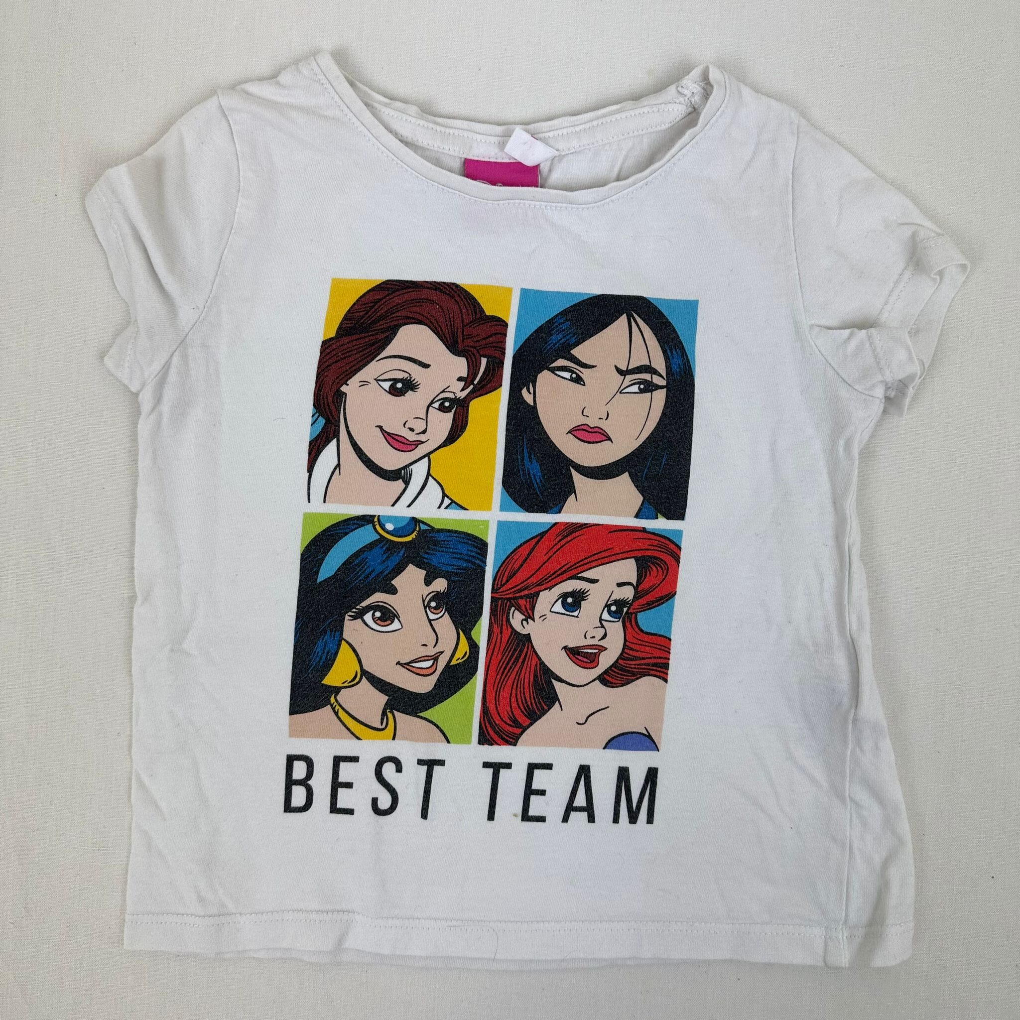Autres commentaires : T-shirt manches courtes blanc avec motif des princesses au milieu « best team ».