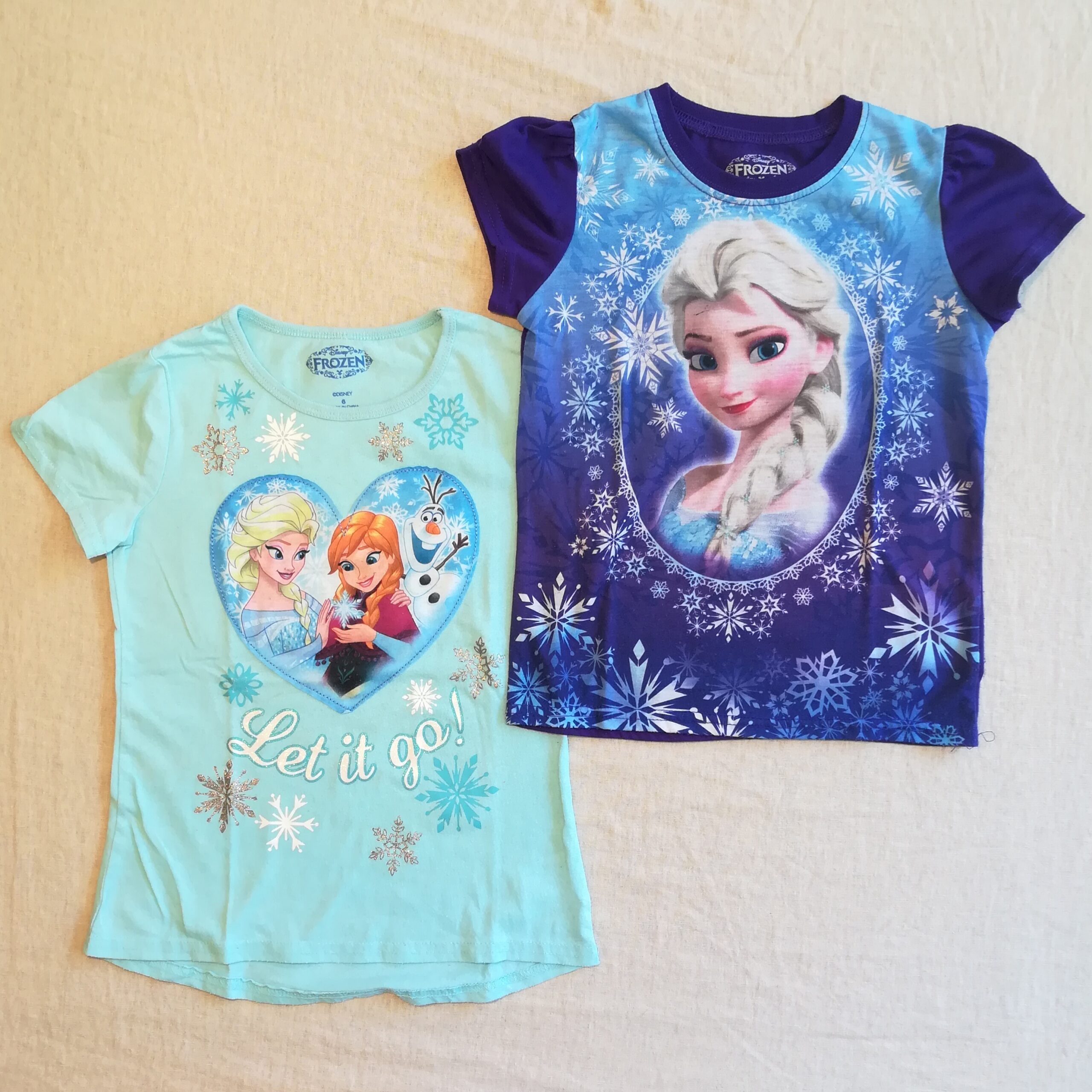 Autres commentaires : 2 T-shirts Frozen, le bleu ciel 60% coton, le bleu/violet a une trace de peinture discrète sur le front. Les deux sont un peu boulochés