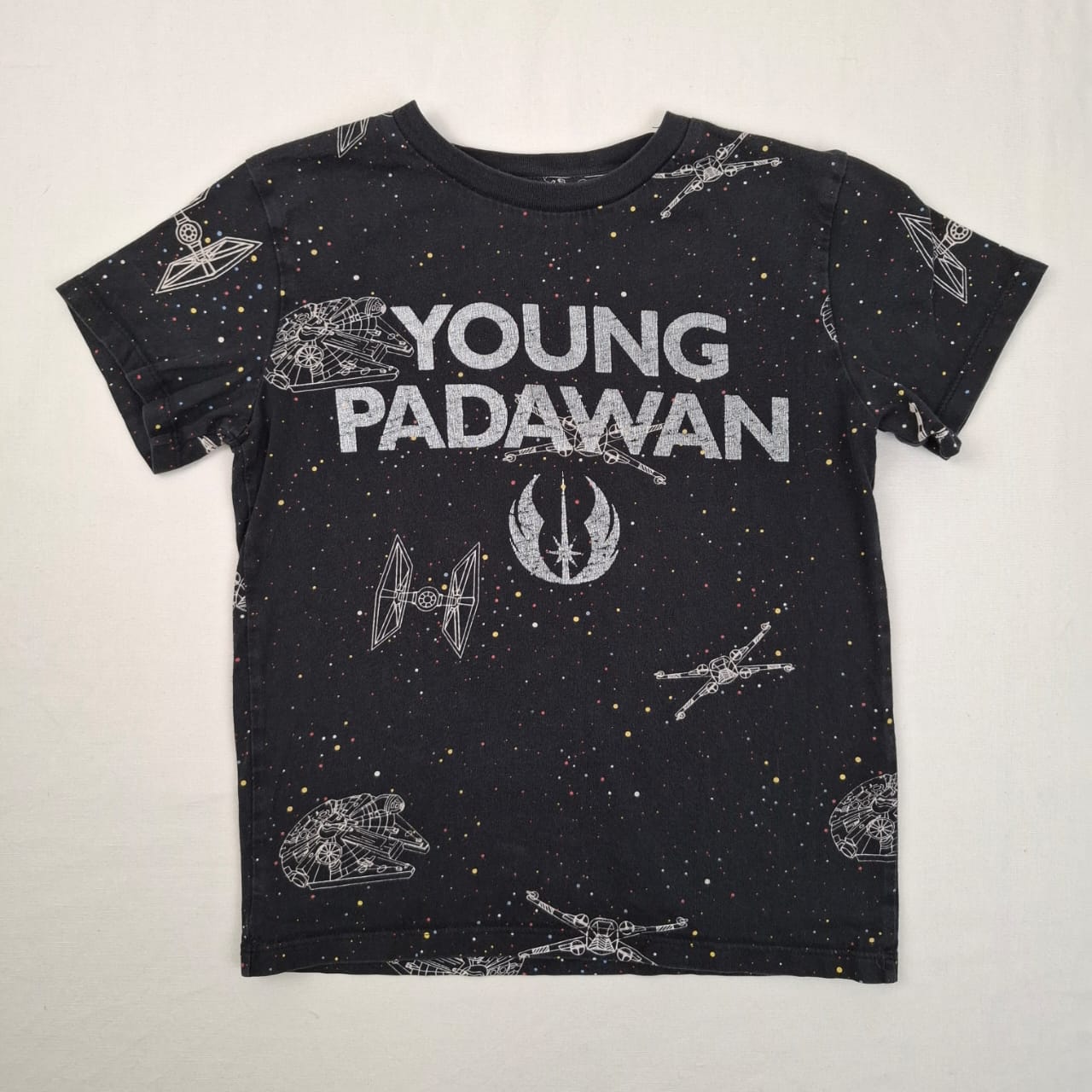 Autres commentaires : T-shirt manches courtes noir Star Wars, parsemé de points multicolores, inscription « YOUNG PADAWAN » argenté sur le devant avec illustrations de Star Wars.