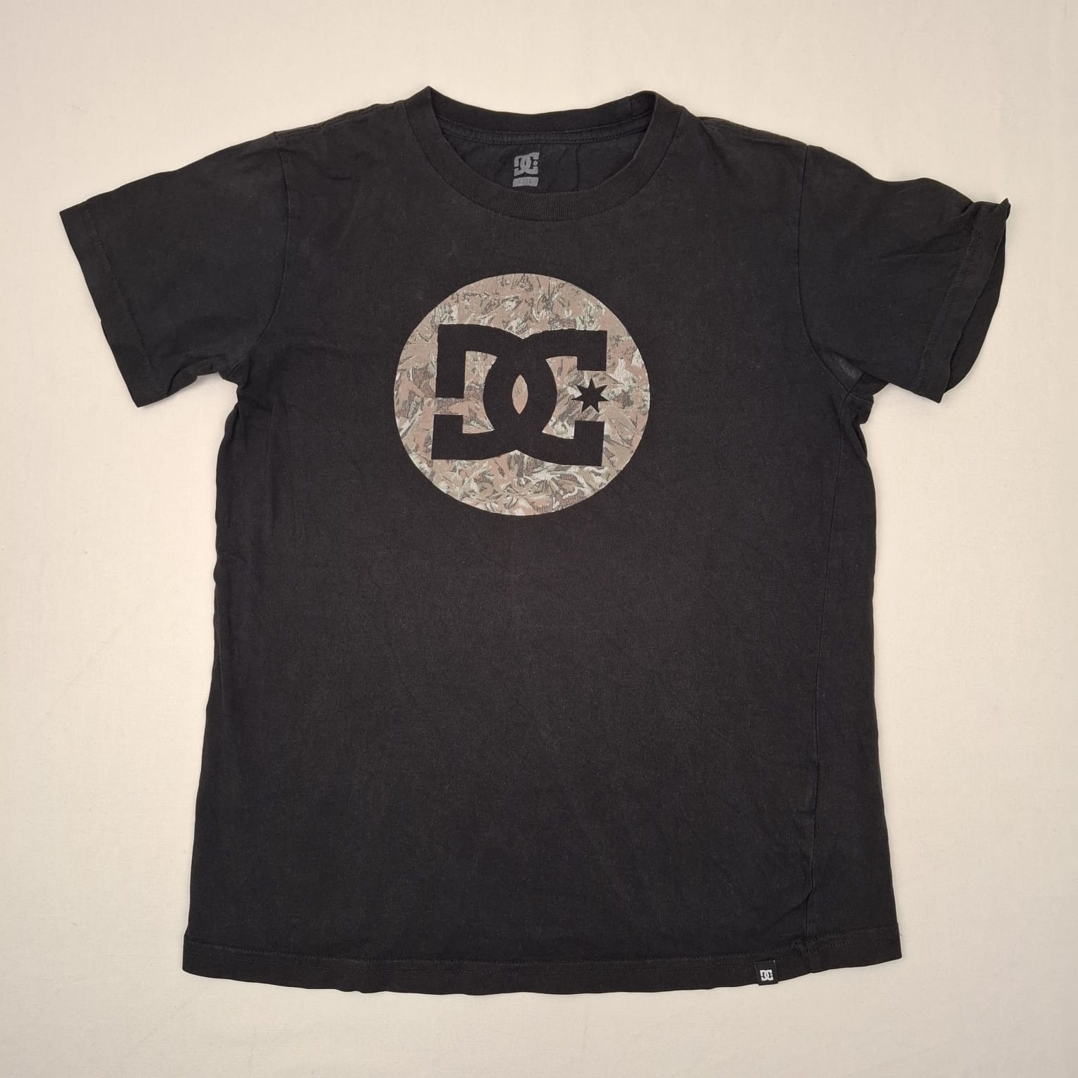 Autres commentaires : T-shirt noir manches courtes, assez large, col rond, rappel du logo sur un rond avec un fond de feuillages verts et rosé. Taille S/10A.
