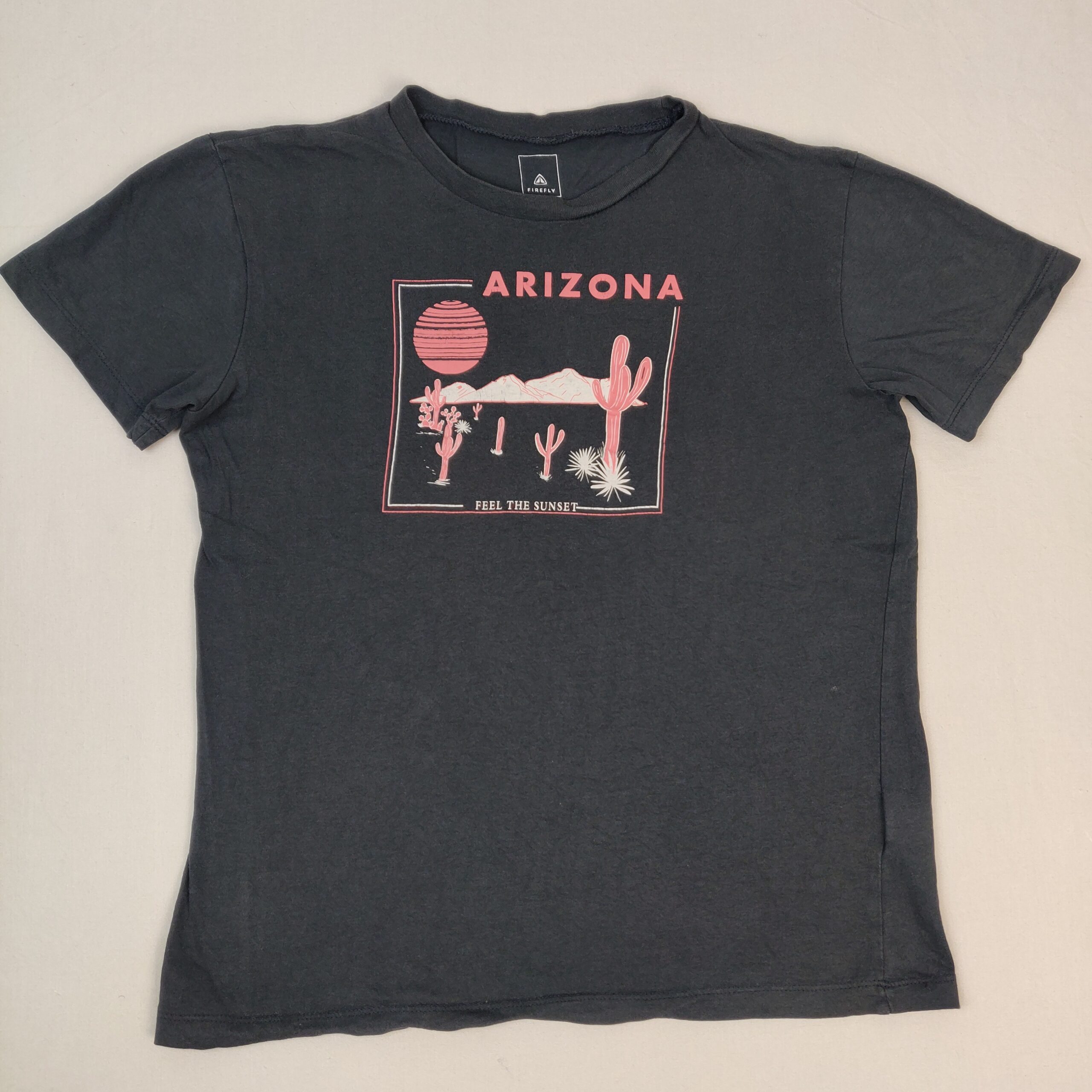 Autres commentaires : T-shirt manches courtes gris, col rond, motif désert en rose et blanc encadré avec inscription en rose « ARIZONA ».