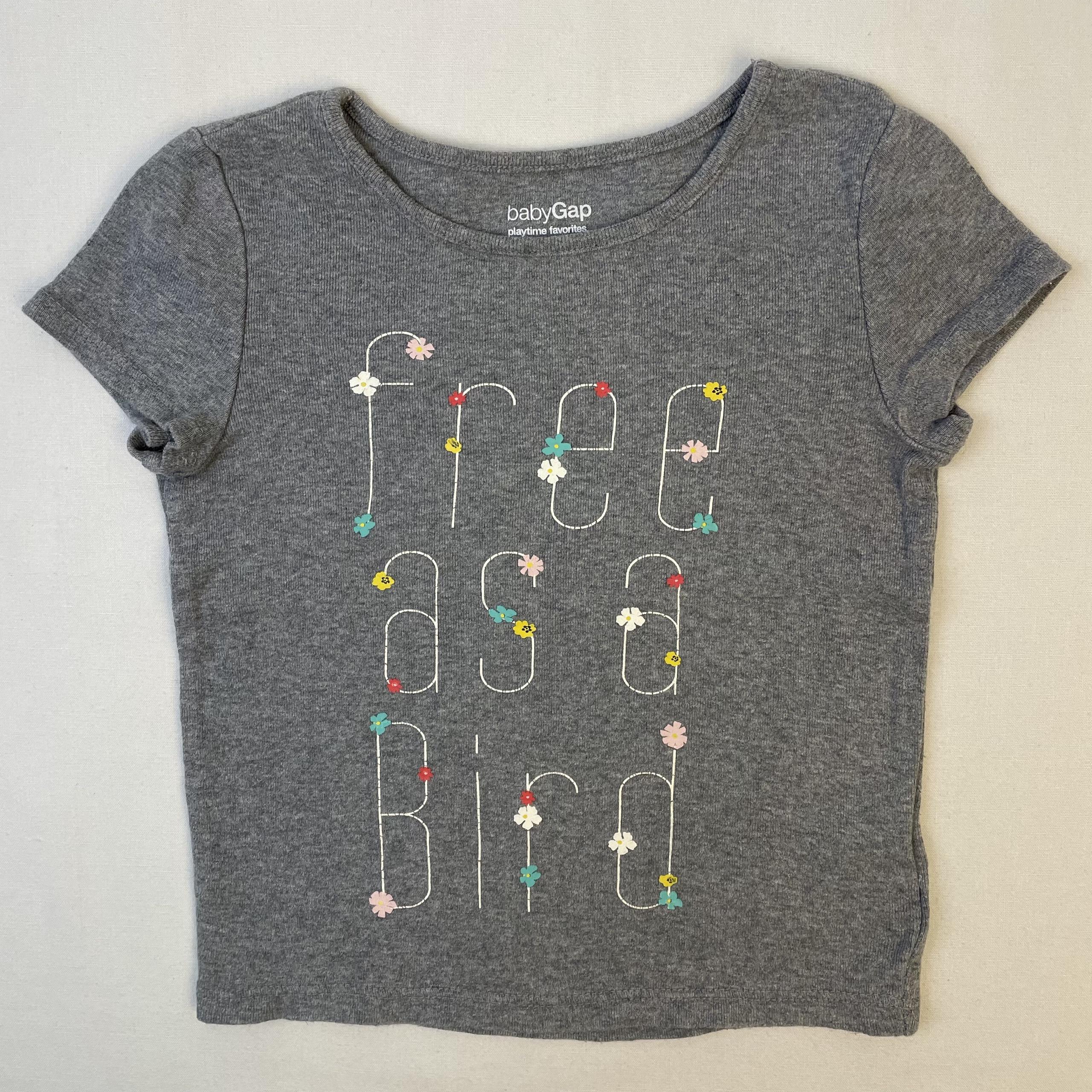 - t-shirt gris, motif fleur, inscription « free as a bird »