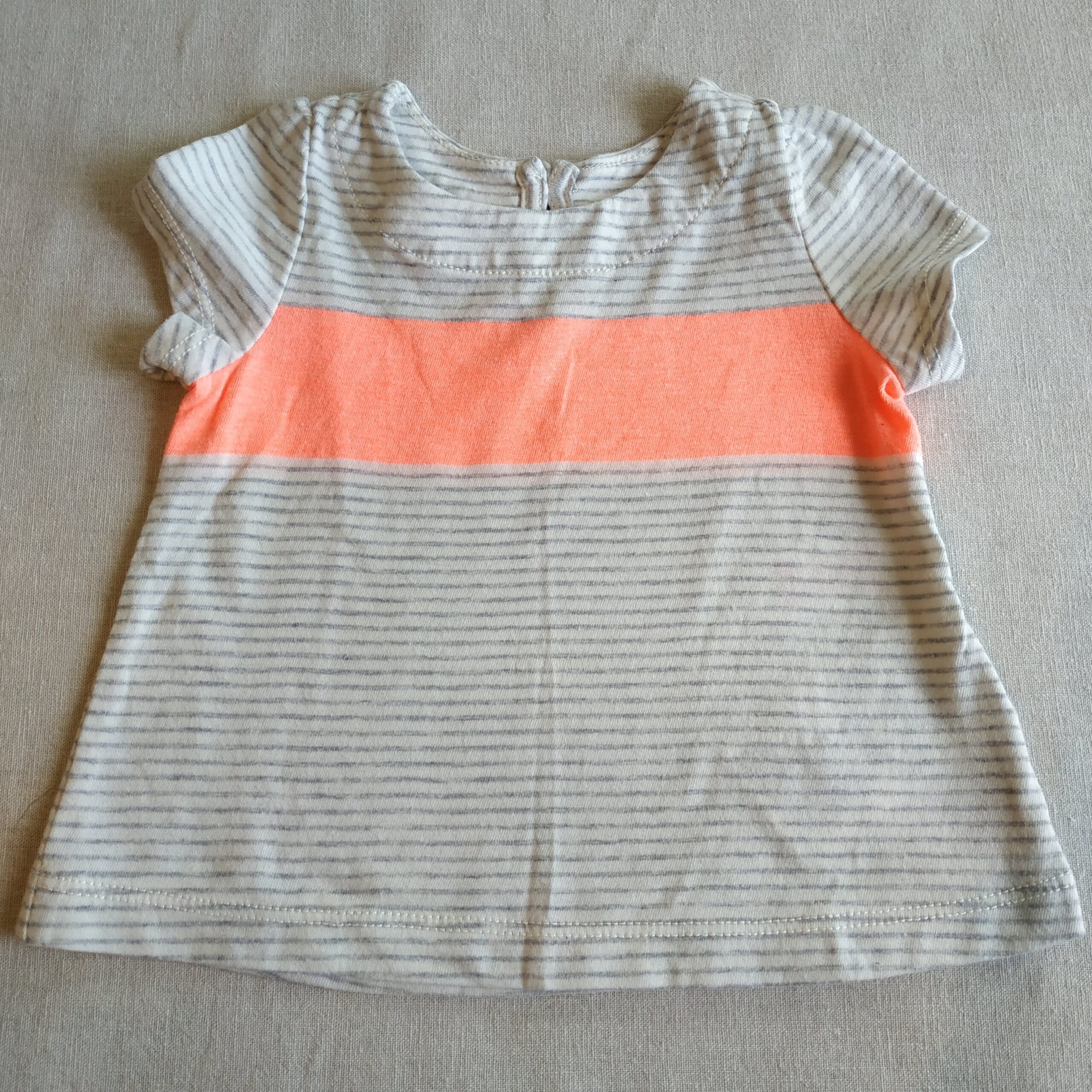 Autres commentaires : 40% polyester. Fines rayures grises horizontales, grande rayure orangé fluo sur la poitrine, ouverture par un bouton à l’arrière du col.