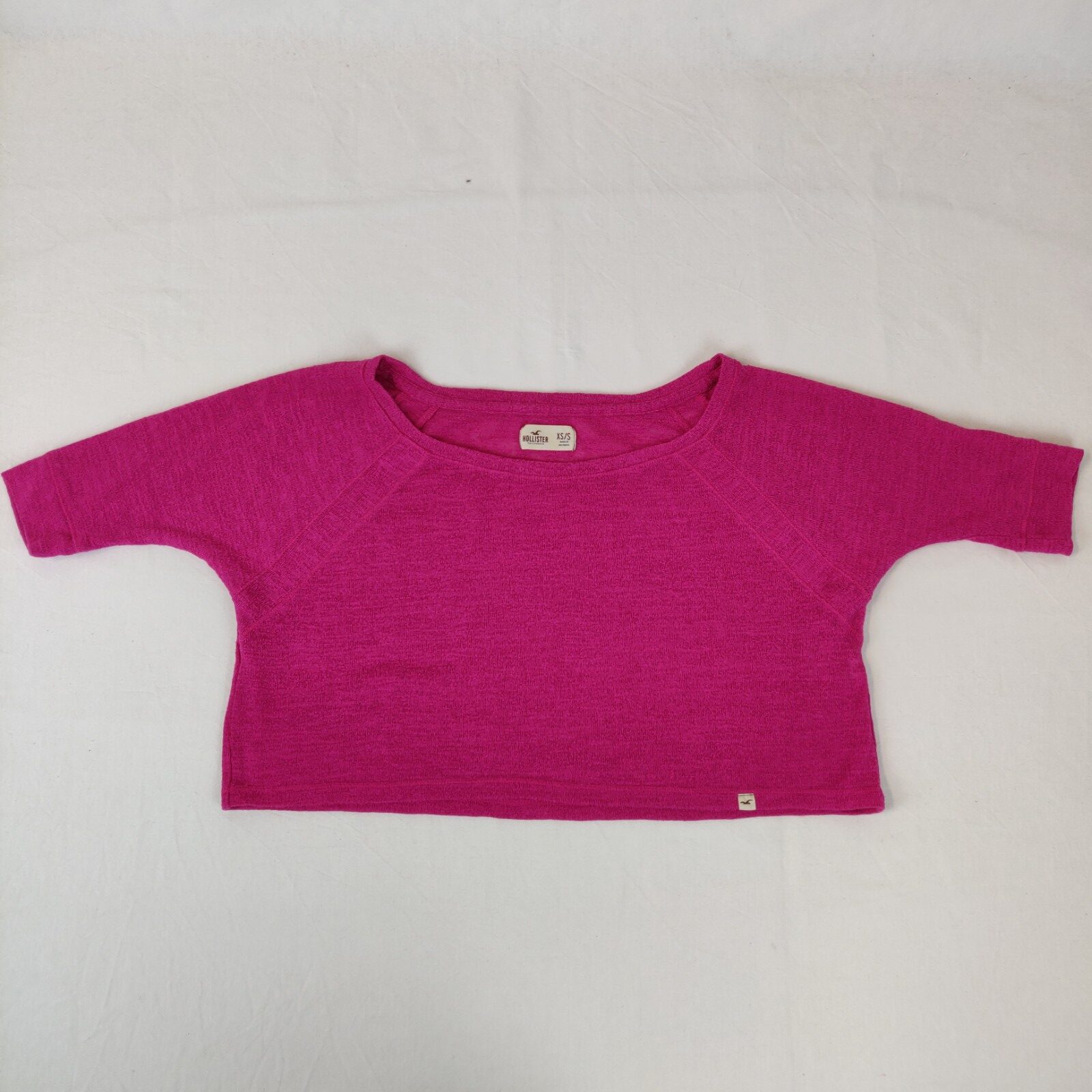 Autres commentaires : T-shirt court à manches courtes en fines mailles rose fushia lègèrement ajourées. (taille XS / S).