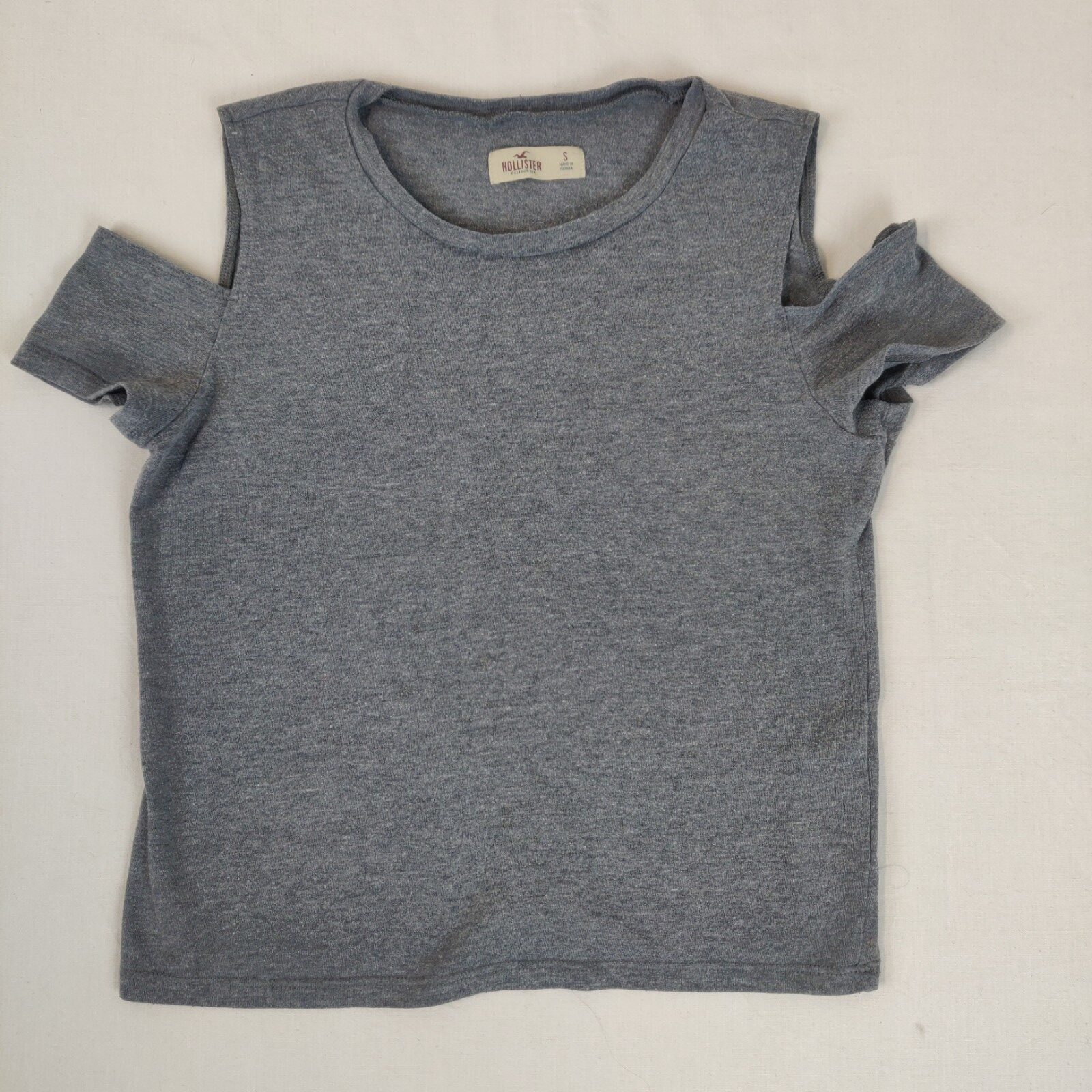 Autres commentaires : 40% polyester. T-shirt à manches courtes déstructurées (taille S estimée à 8 ans) – gris chiné. Usure normale.