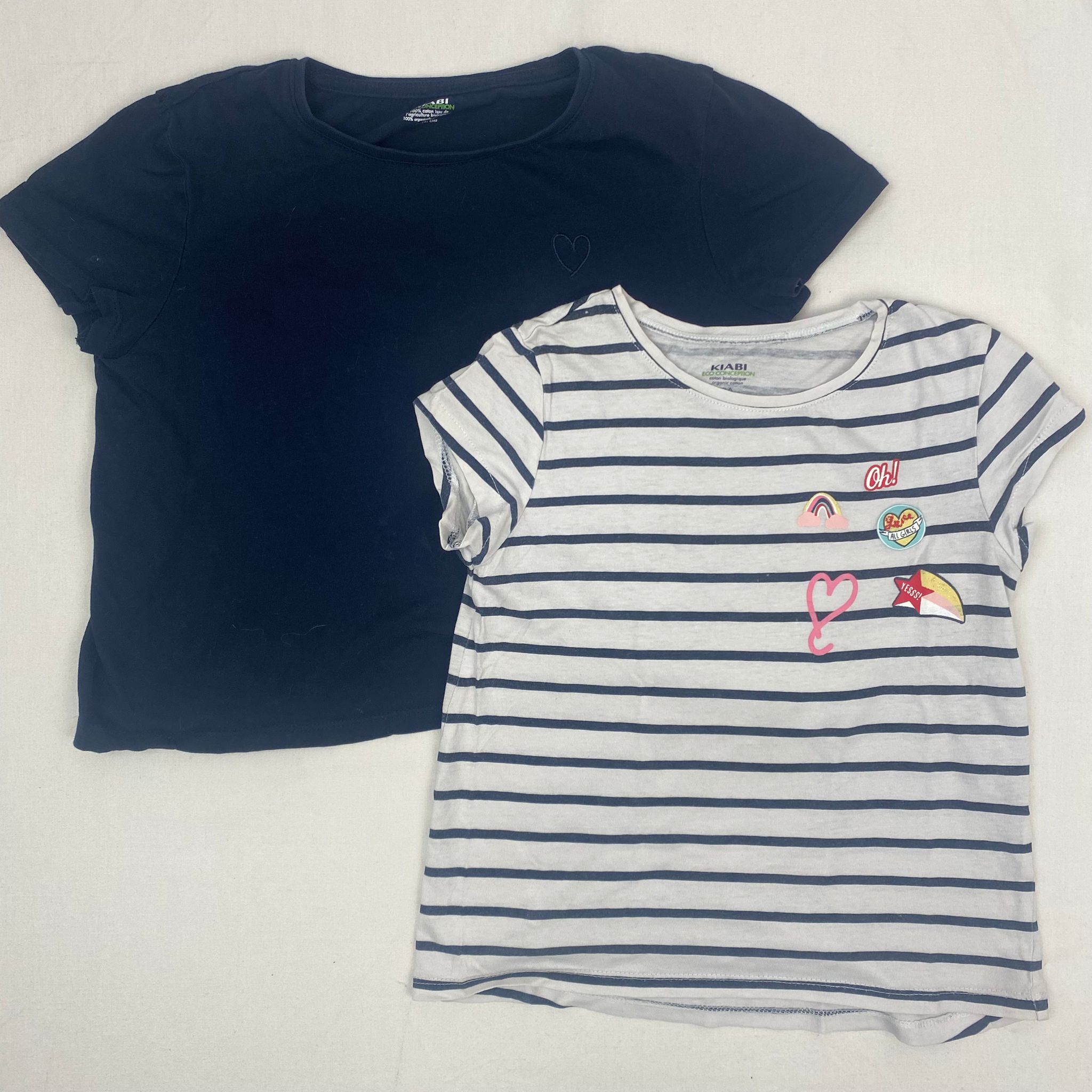 Autres commentaires : Lot de 2 t-shirts bleus foncé Kiabi manches courtes : -un à motif coeur et un autre à rayures bleu marine et blanches.