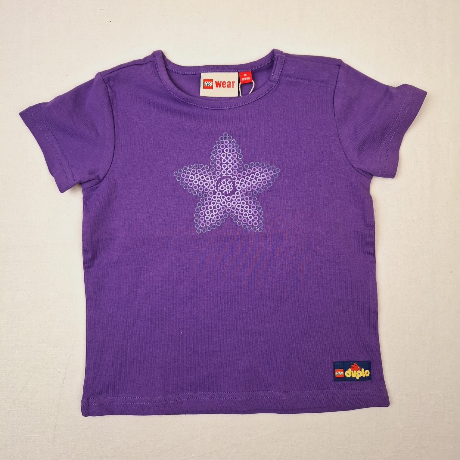 Autres commentaires : 5% élasthanne. T-shirt violet à manches courtes, motif fleur, col rond, fermeture par boutons sur l’épaule gauche.