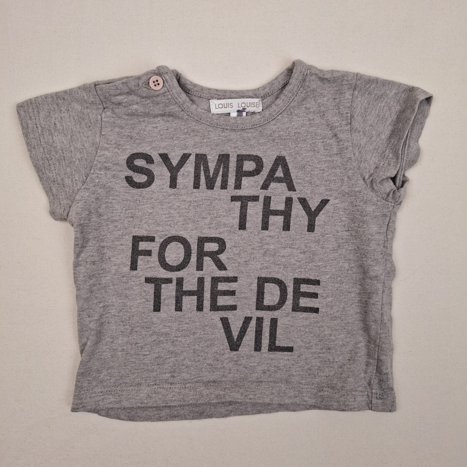 Autres commentaires : T-shirt gris, 12 mois, Louis Louise, col rond avec un bouton sur le coté pour l’ouvrir, inscription » SYMPATHY FOR THE DEVIL » à l’avant du T-shirt, gris légèrement passé