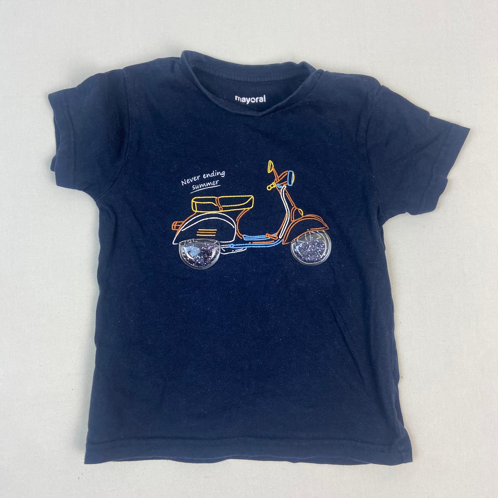 Autres commentaires : T-shirt manches courtes bleu foncé, col rond, motif « SCOOTER », fermeture par boutons pression à l’épaule.
